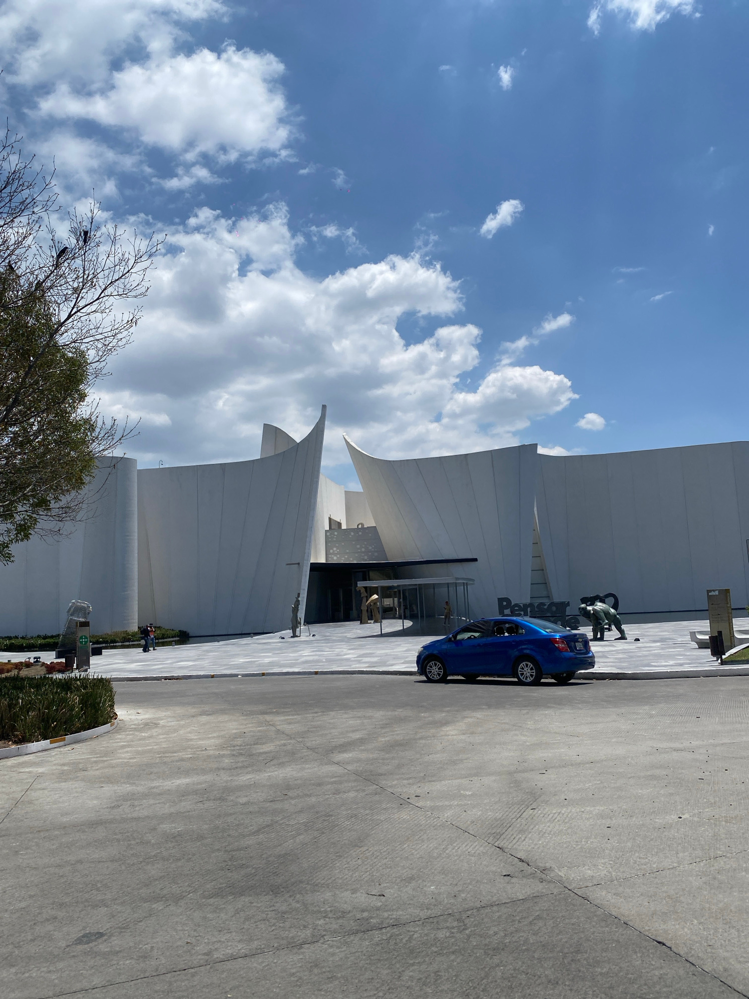 The image shows the Pensacola International Airport terminal in Pensacola, Florida. A blue sedan is parked near the entrance. Sculptures are visible next to the building. The sky is partly cloudy. The…read more