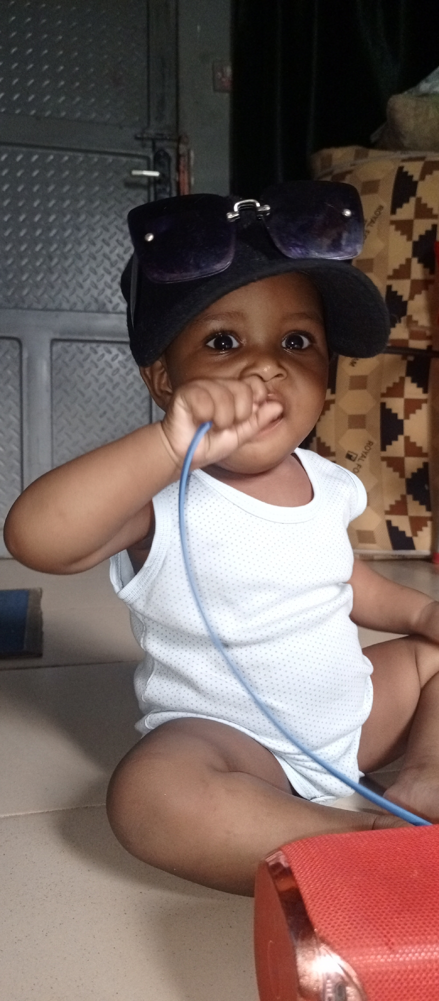 The image depicts an infant seated on the floor, wearing a white sleeveless shirt, a black hat, and oversized sunglasses perched on the hat. The infant has dark skin, and is holding a blue cord in the…read more