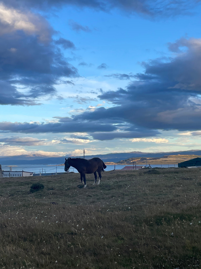 The image depicts a rural-urban transitional landscape in Ushuaia, Argentina, under an overcast sky with patches of clear blue. The scene is dominated by a dark brown horse, standing near the center,…read more