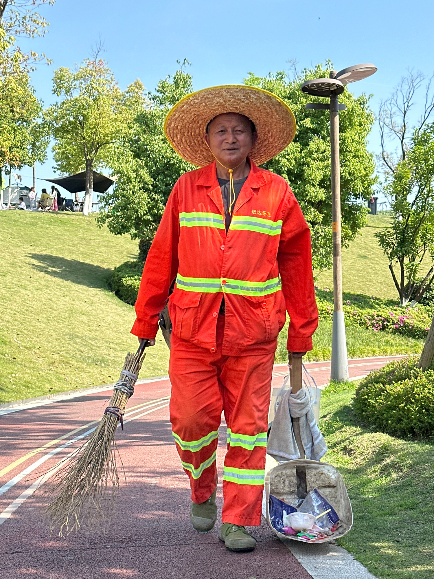 A man in orange reflective work clothes and a straw hat is standing outside in Jiangjin, China. He is holding a broom in his left hand, and his right hand is holding a shovel attached to a bin, which…read more