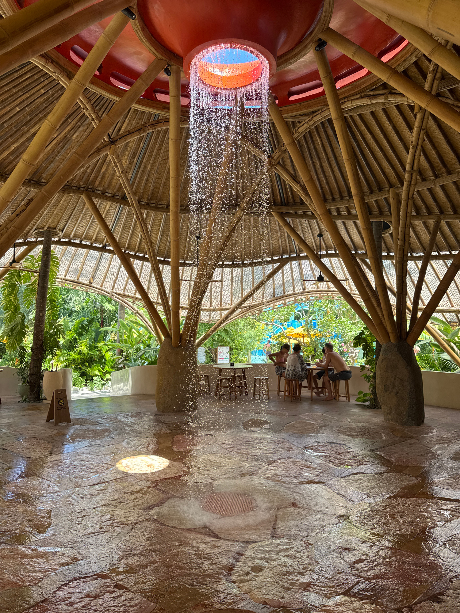 The image captures the unique architectural design of the Potato Head Studios in Kuta, Indonesia. Looking upwards, a bamboo structure supports a red, circular element with an opening that reveals the…read more
