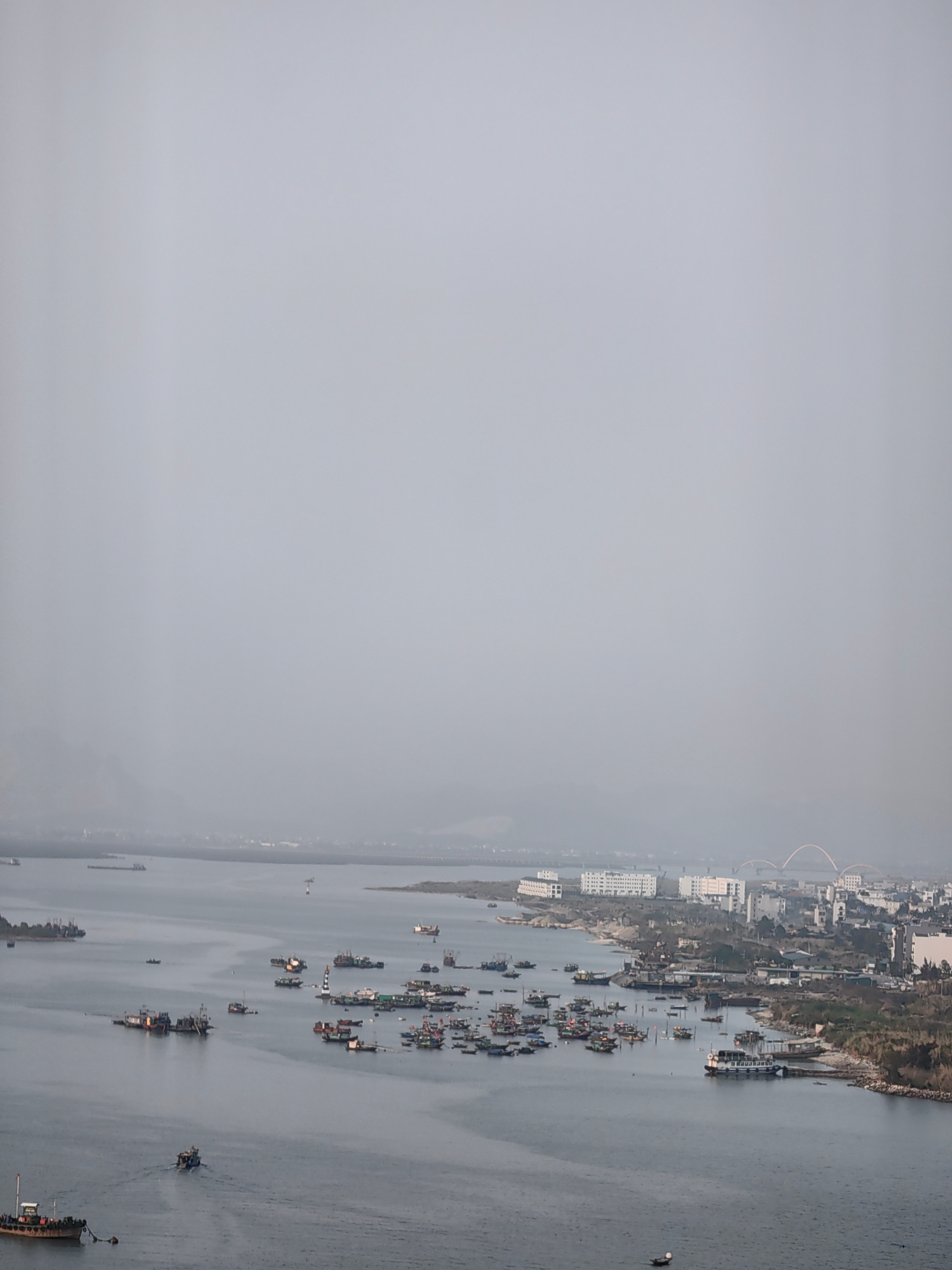 The scene is a view of Ha Long Bay from an elevated position in Hong Gai Ward, Vietnam. In the foreground, the bay is populated with numerous boats of various sizes, mostly fishing vessels. The water…read more