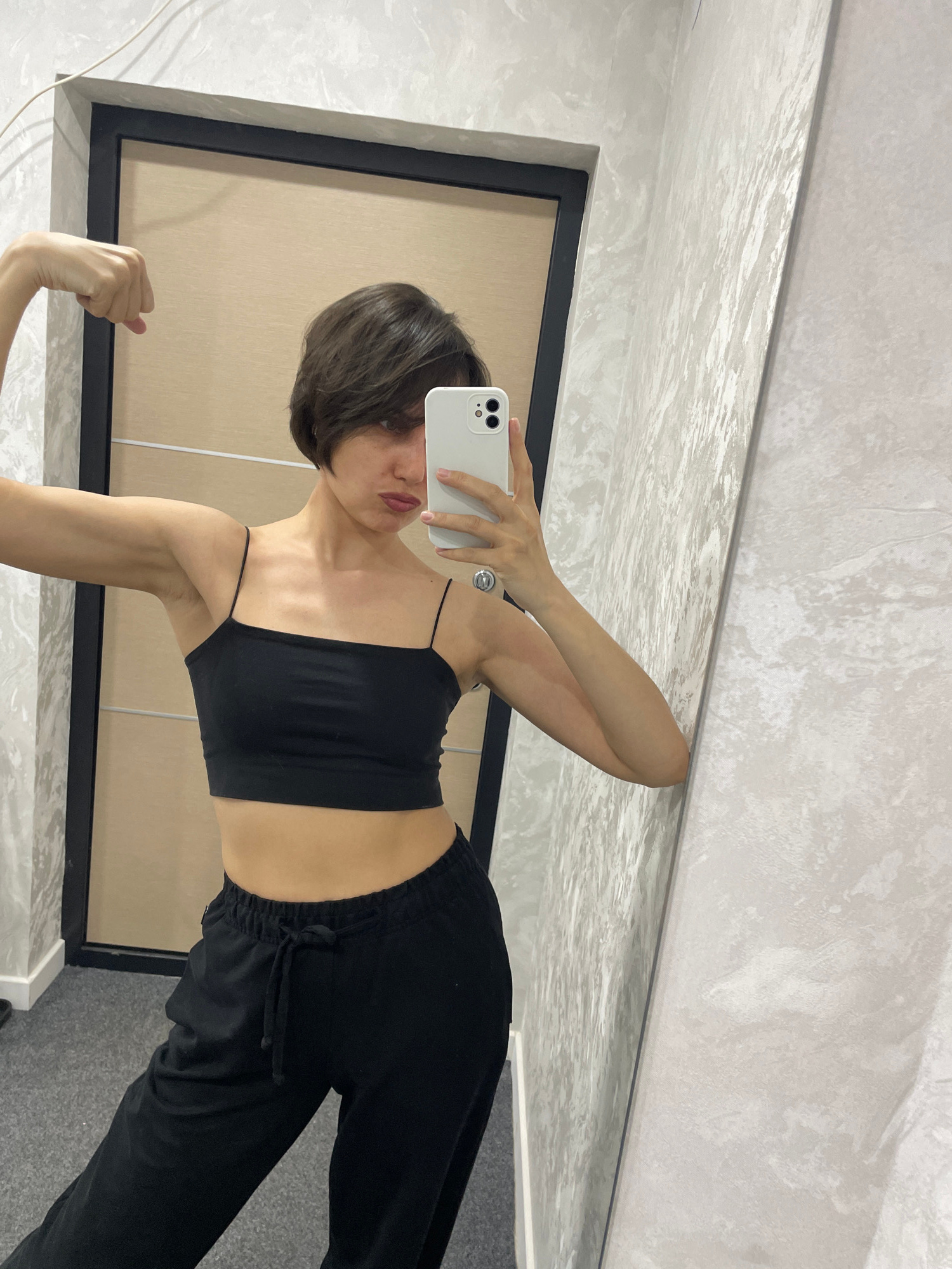 A young person with short brown hair is taking a selfie in front of a mirror. The person is wearing a black spaghetti strap crop top and black sweatpants. Their left arm is flexed. The background incl…read more