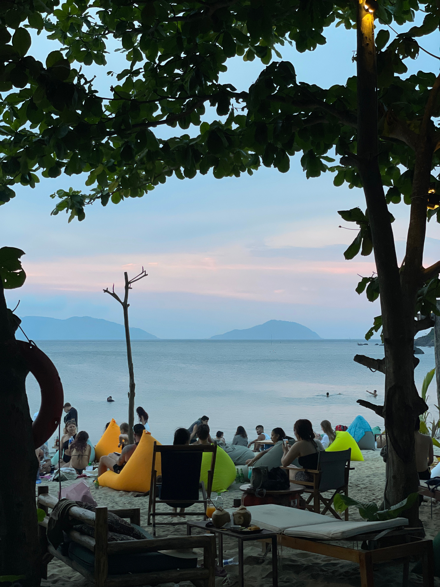 The image depicts a twilight scene at a beachside establishment in Đà Nẵng, Vietnam, positioned on a sandy shore facing a mountainous coastline, likely the Sơn Trà Peninsula. The foreground features a…read more