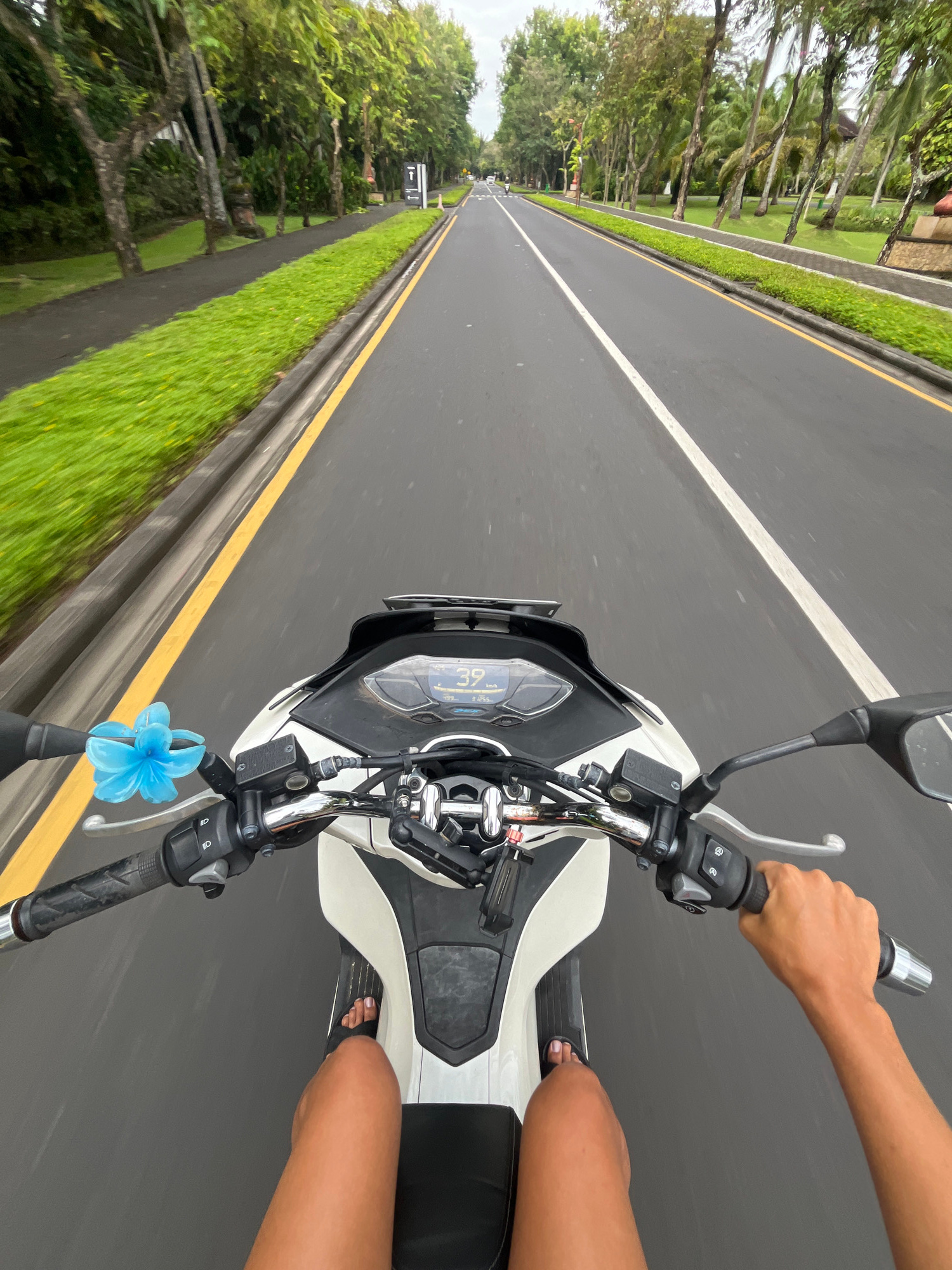 This first-person perspective image captures a person riding a white scooter or motorcycle on a paved road. The road stretches into the distance, with a solid white line marking the center and double…read more