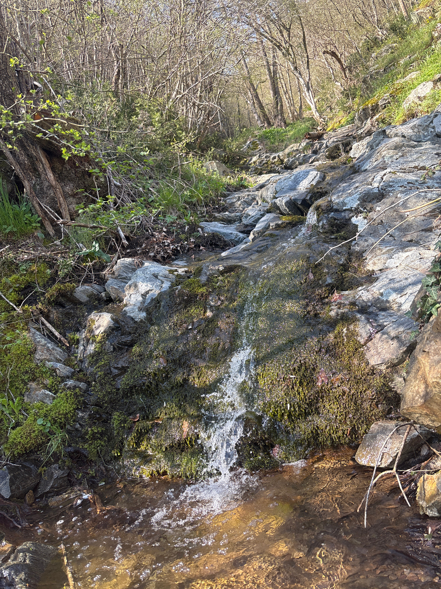 The image captures a natural outdoor scene, likely in a forest or woodland setting, near a stream in Alamovtsi, Bulgaria. The central focus is a rugged, grey rock face that forms one bank of a narrow…read more