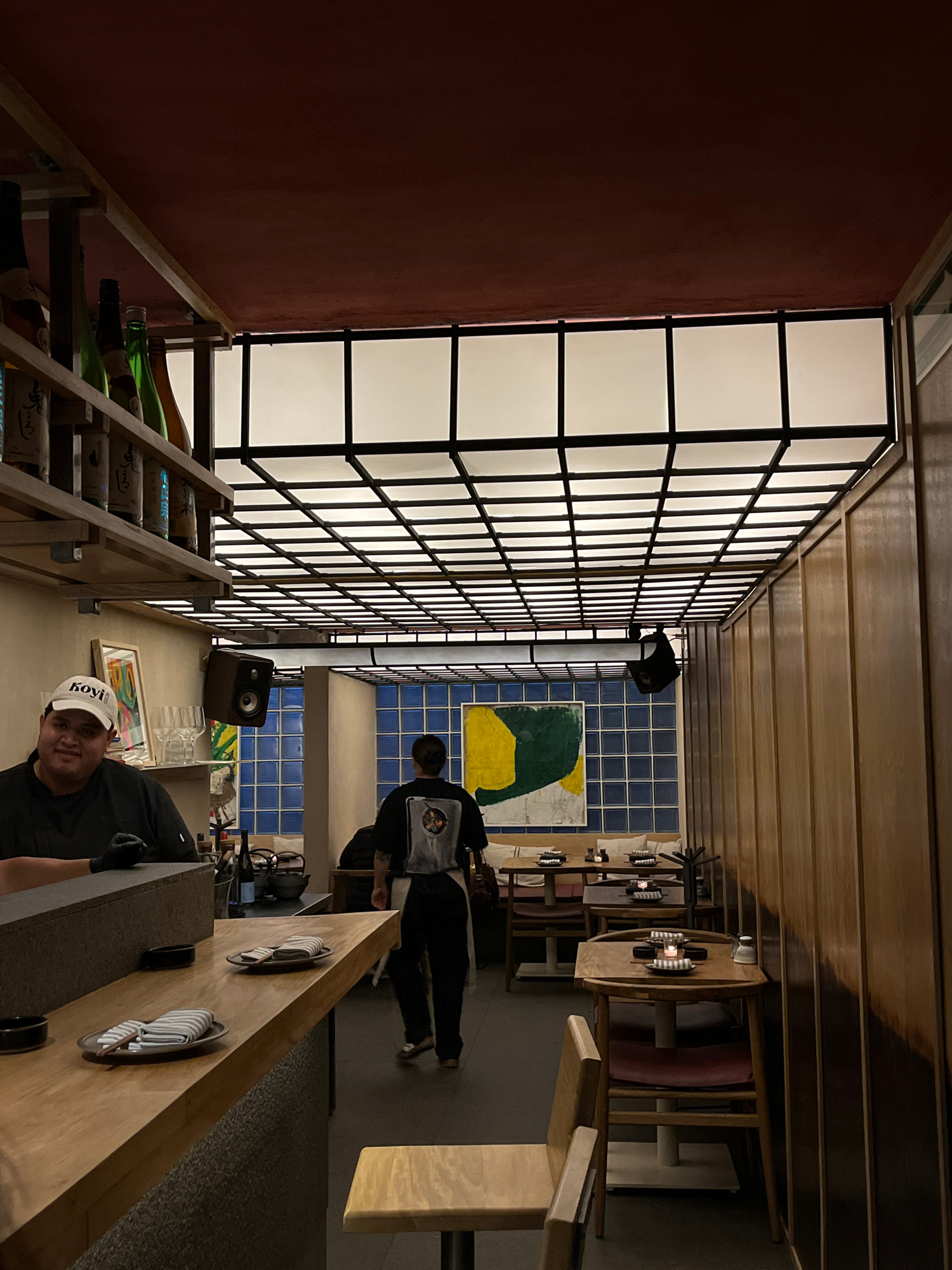 The image shows the interior of a restaurant, possibly Koji, located in Mexico City, Mexico. A person wearing a "Koji" branded cap is visible in the foreground. In the background, a server in a unifor…read more
