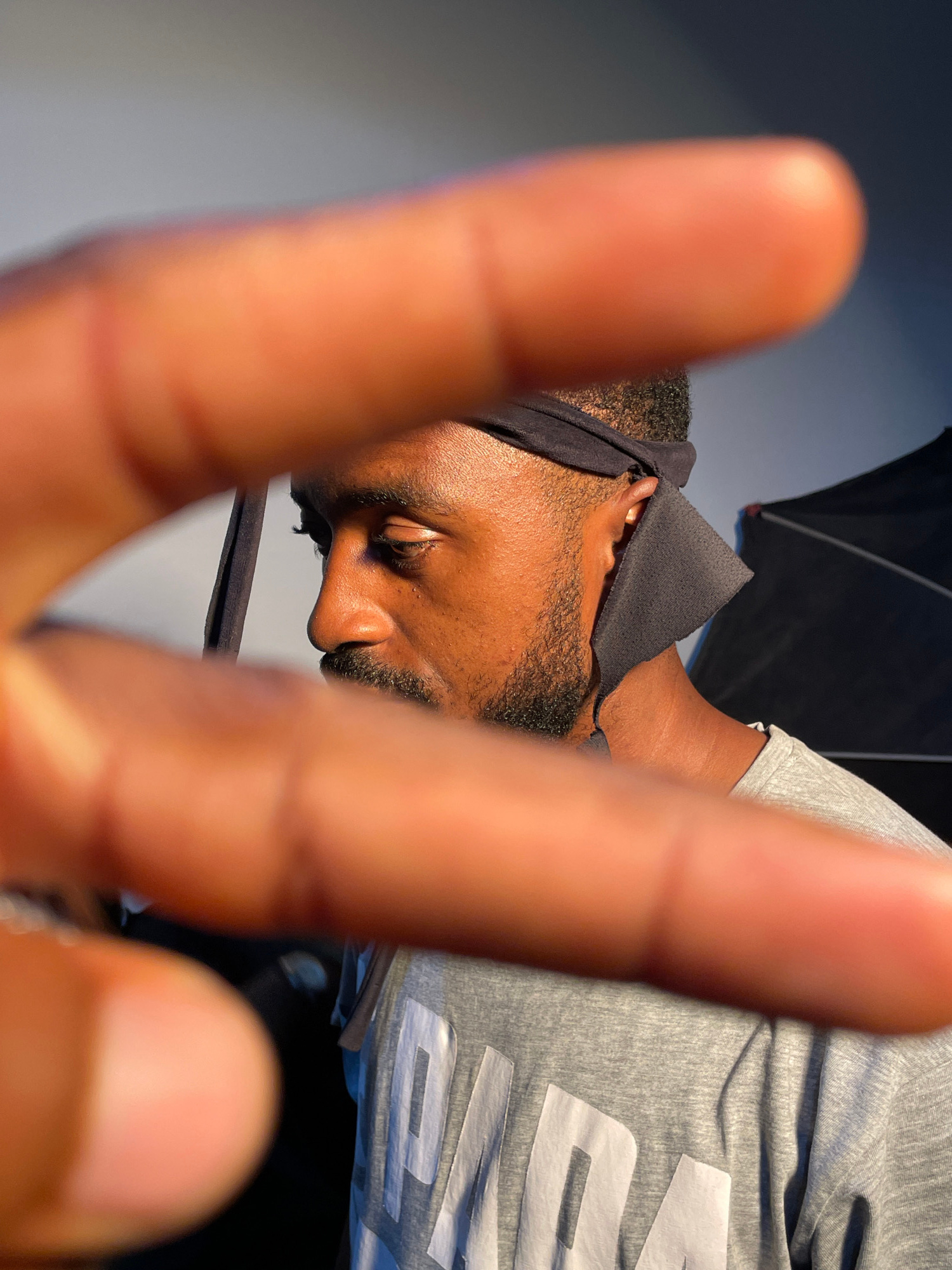 A close-up, slightly rotated image shows a dark-skinned person with a beard and a black head covering. The person's eyes are closed. Two out-of-focus fingers fill the foreground, obscuring parts of th…read more