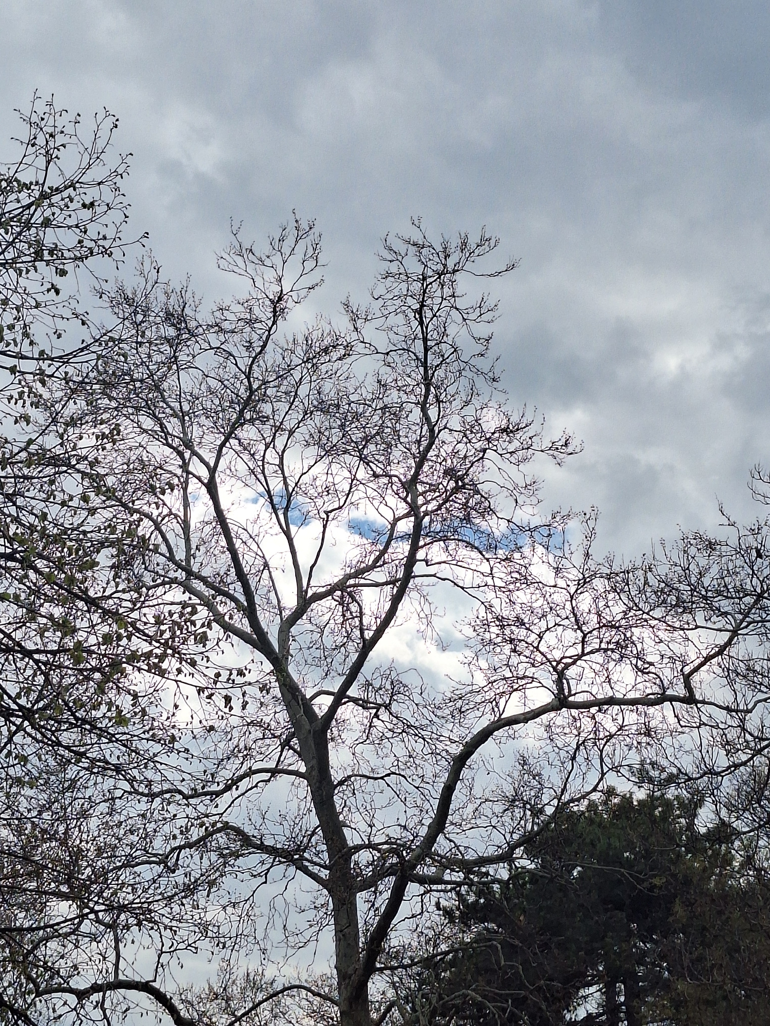 The image captures a view looking upward through a network of tree branches against a cloudy sky in Varna, Bulgaria. The branches appear to be mostly bare, with some budding leaves. The sky is overcas…read more