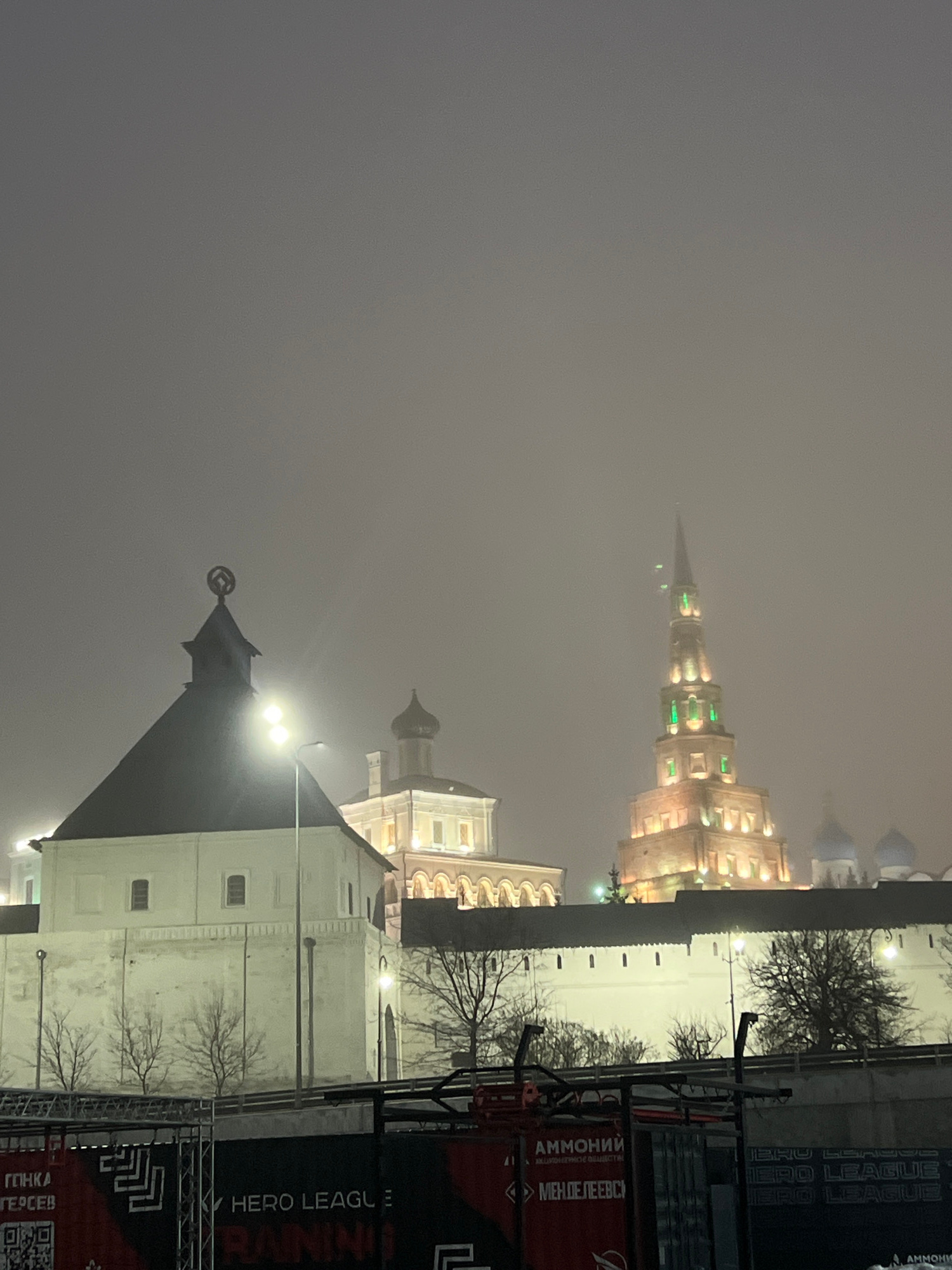 The image shows a low-angle view of Kazan Kremlin buildings under a foggy night sky. The tower of the Suyumbike Tower stands out with a star and its dark spire on top. In the background, the multi-tie…read more