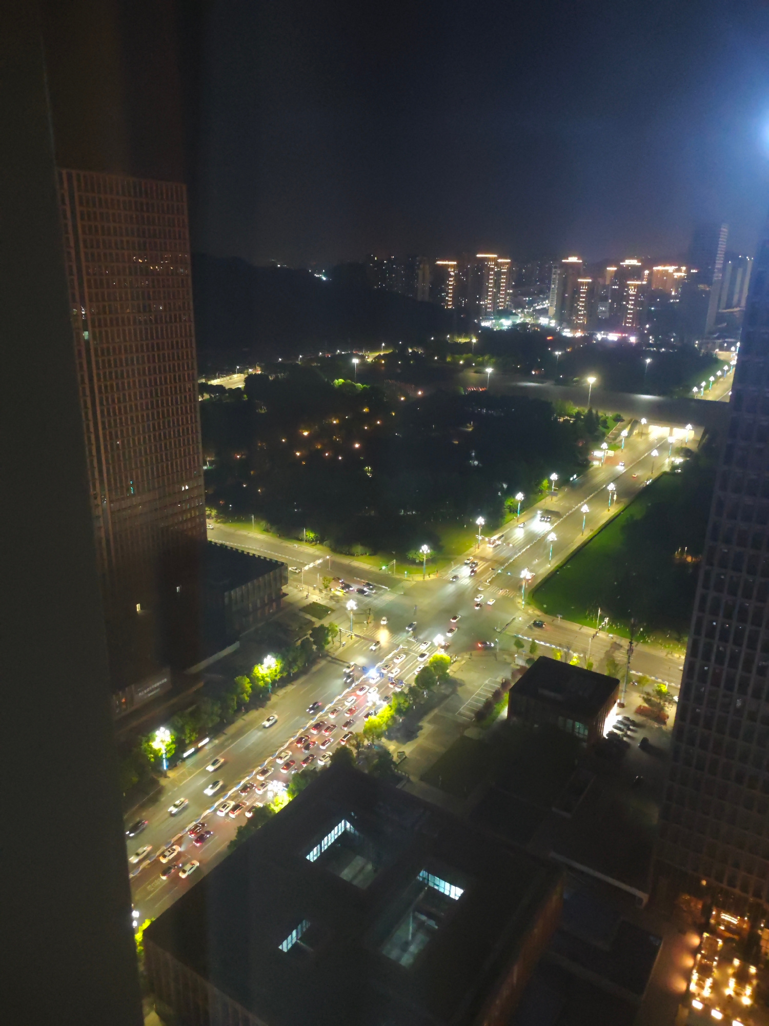 View from a high vantage point overlooking a city scene at night. Streets below are illuminated by streetlights and car headlights, creating streaks of light from the moving traffic. Buildings in the…read more