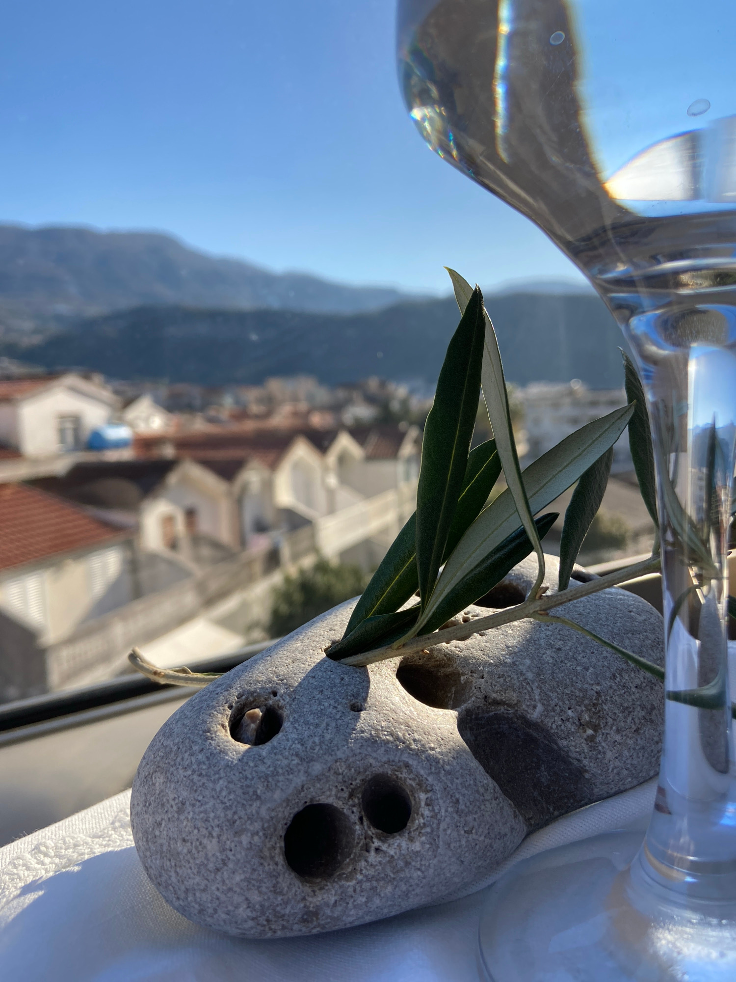 A still life image shows a porous gray rock with multiple holes that give it a face-like appearance. An olive branch with green leaves is placed between the rock and a clear, water-filled vase. The va…read more