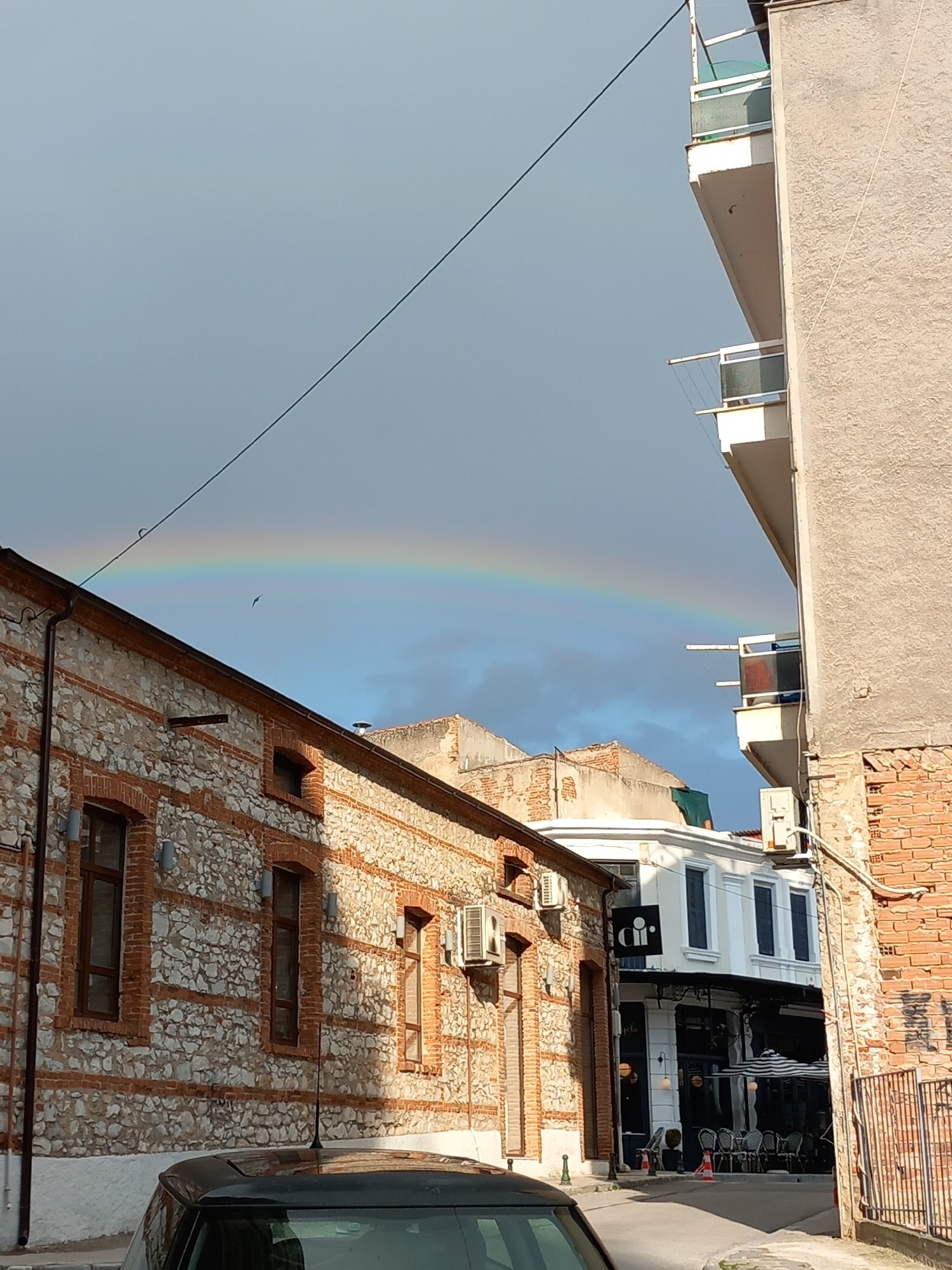 The image shows a partial rainbow in the sky over an urban scene in Drama, Greece. The view is angled upwards, with buildings framing the rainbow. One building has a facade of light-colored stone with…read more