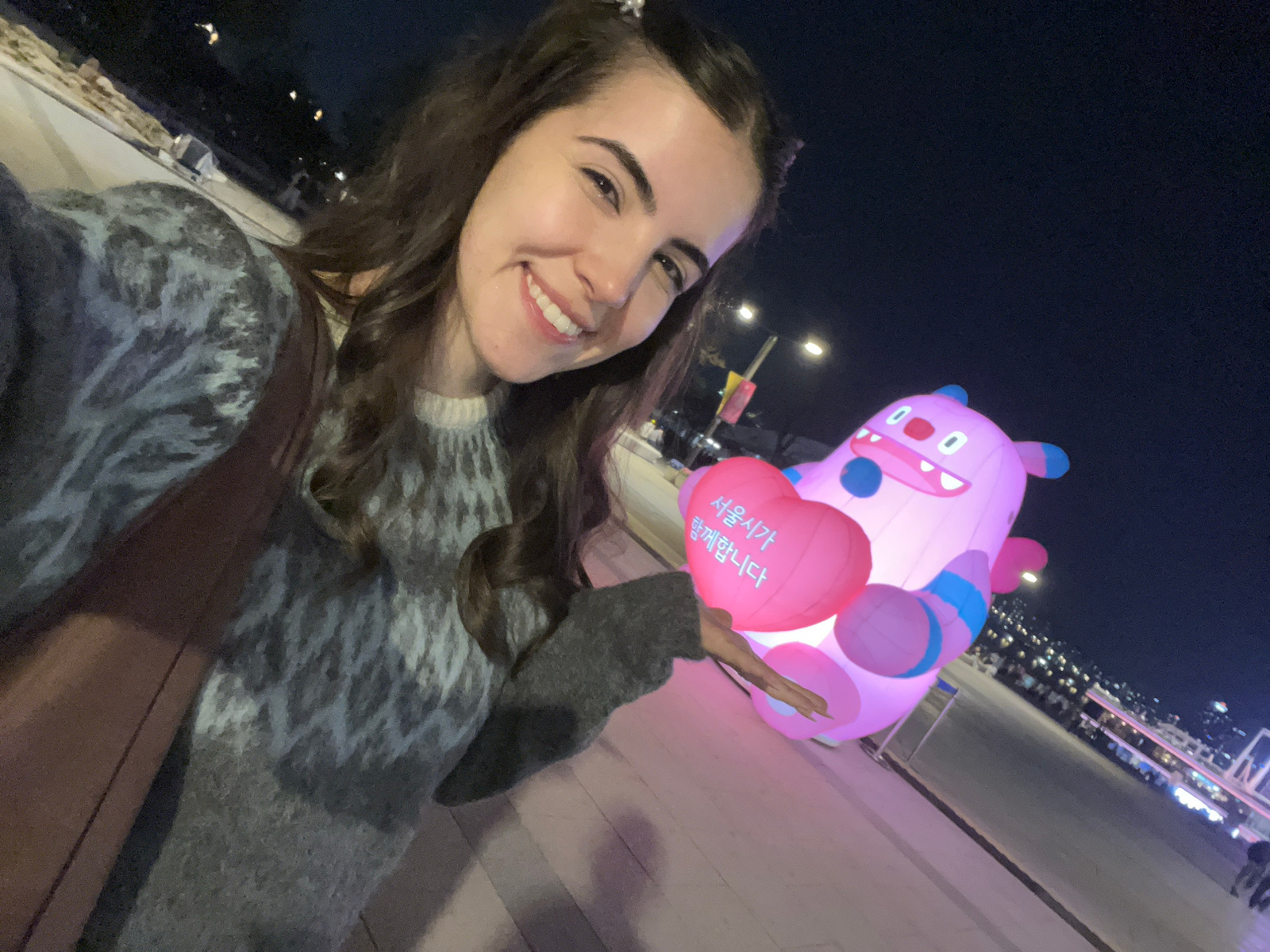 A woman is taking a selfie at night. In the background is a large, inflated pink cartoon character. The cartoon character is a hippo with big eyes, open mouth and arms out. It has pink and blue spots,…read more