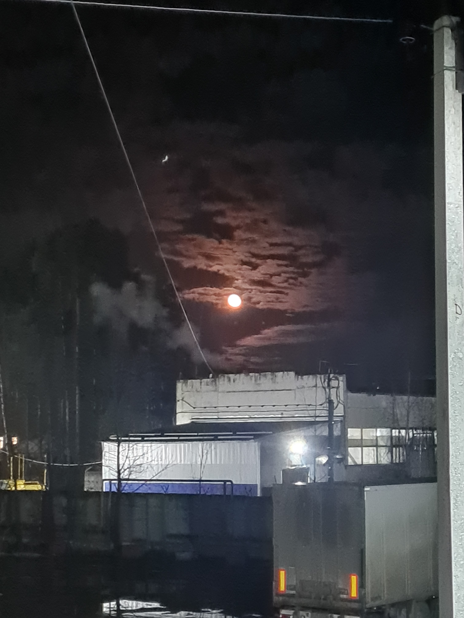 The image depicts an outdoor scene at night. A bright, circular light source, possibly the moon, is visible in the left side of the frame, surrounded by dark, textured clouds. A thin wire or cable str…read more