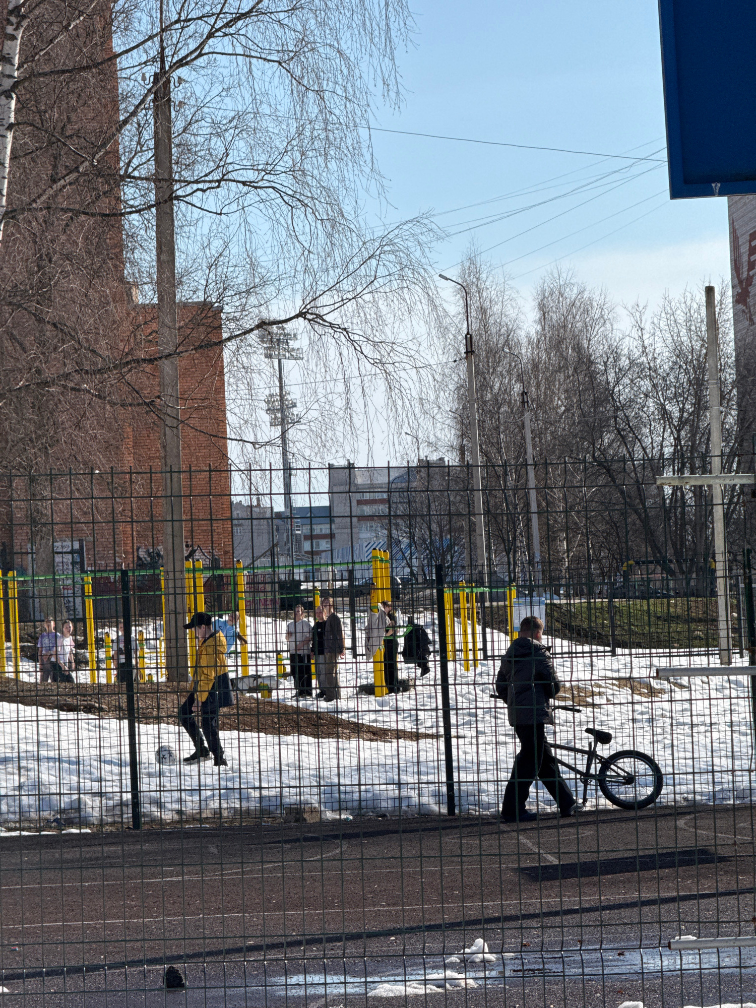 The image depicts a scene in Votkinsk, Russia, as evidenced by the typical Soviet-era architecture of the building in the background. The scene shows a group of people gathered near a metal fence, pos…read more