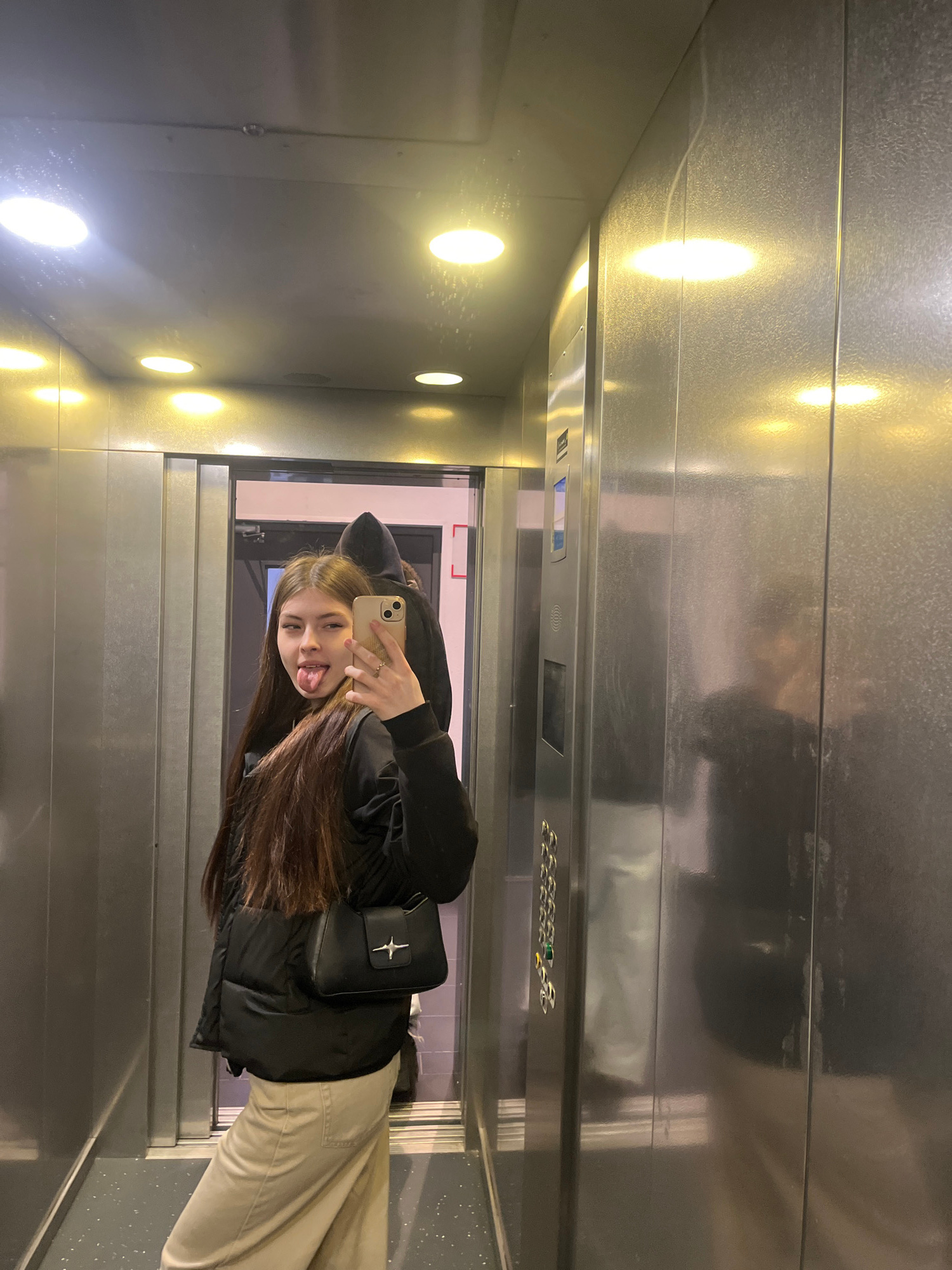 A young woman in Saint Petersburg, Russia, is taking a selfie in a mirrored elevator. She is wearing a black hooded sweatshirt, a black puffer vest, beige pants, and a black purse with a white star-li…read more