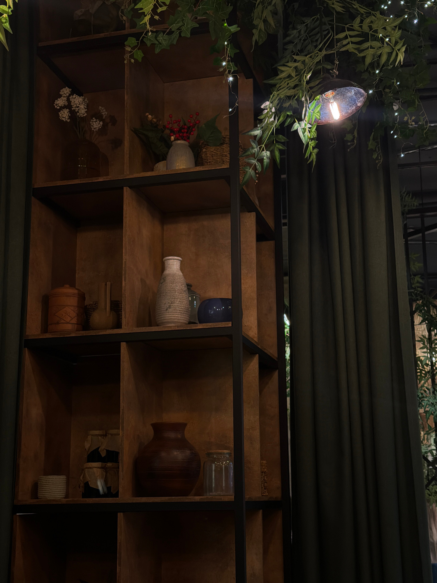 The image depicts a wooden shelf unit with various decorative items. The shelves are dark wood with a black metal frame. On the shelves are vases, decorative flowers, and other small objects. The ligh…read more