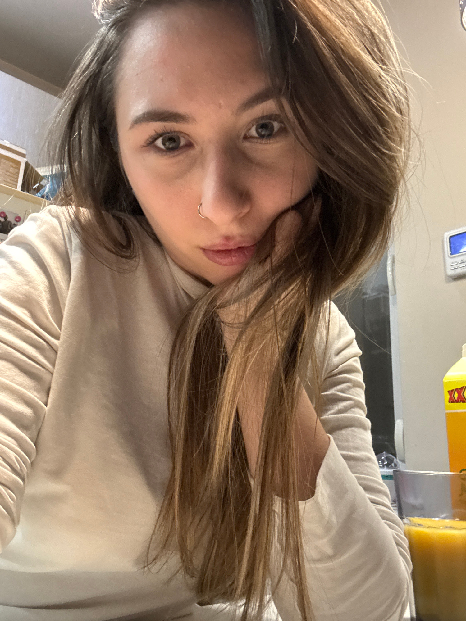 A woman with light brown hair is posing for a selfie indoors. She is wearing a beige long-sleeved shirt. Her face is tilted towards the camera, and she has a small hoop earring in her nose. In the bac…read more