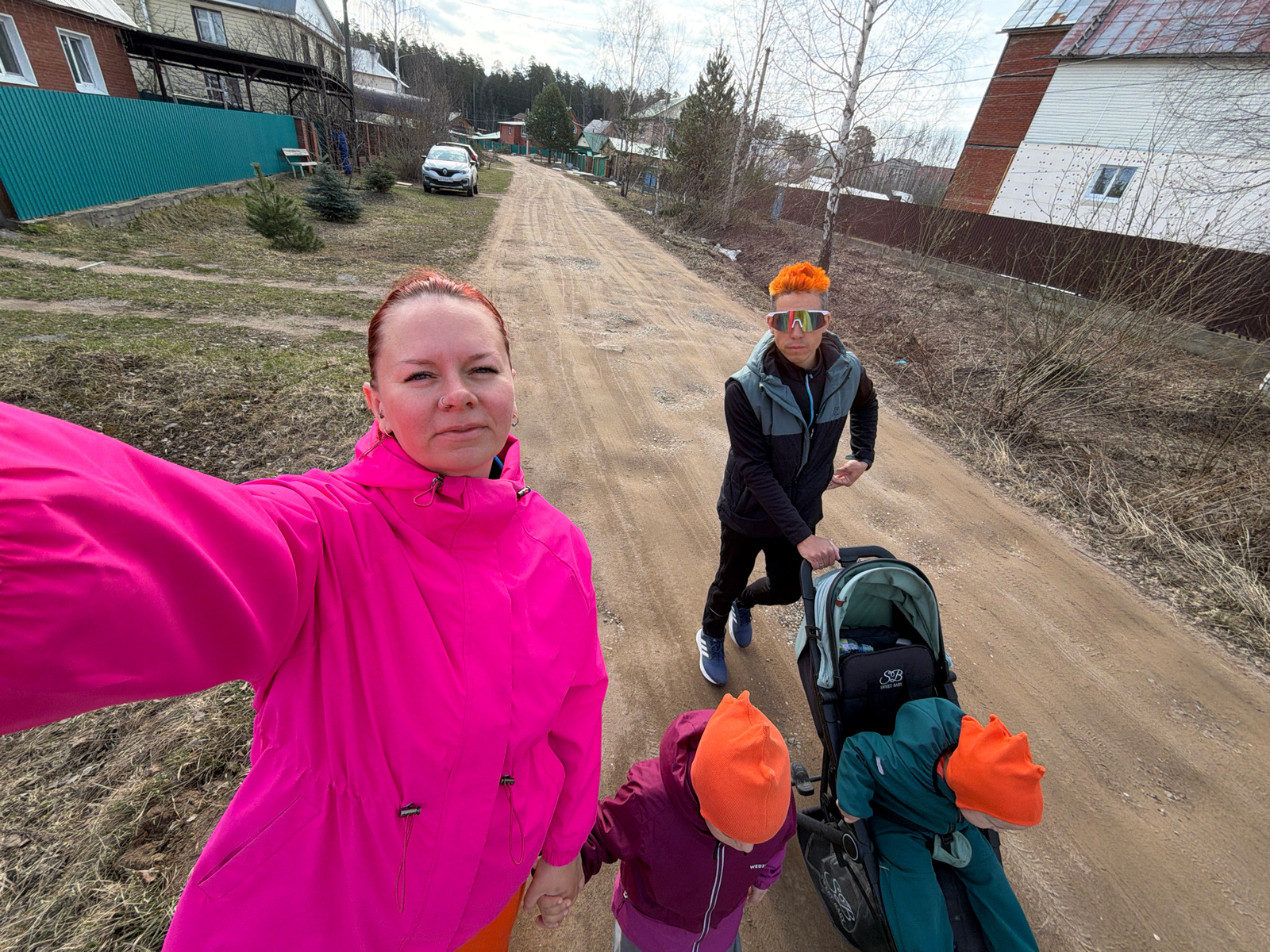 A woman in a pink jacket takes a selfie of herself, a woman in sunglasses and a gray/black jacket, and two children with orange hats walking on a dirt road in Chaikovsky, Russia. One child is in a strβ¦read more