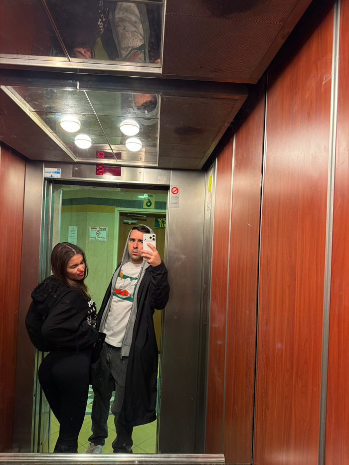 The image depicts an interior view of an elevator, occupied by two individuals. The right wall of the elevator is constructed from reddish-brown wood paneling separated by vertical metallic strips. Th…read more