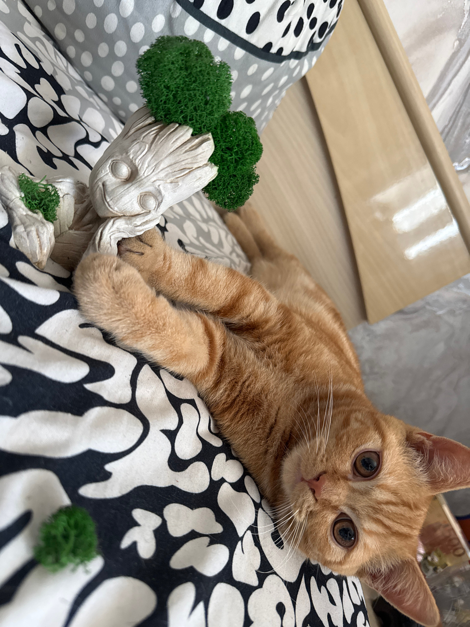 This indoor photograph, taken in Chaikovsky, Russia, features an orange tabby cat as its central subject. The cat is lying on a patterned bed or cushion, looking directly at the viewer with wide, curi…read more