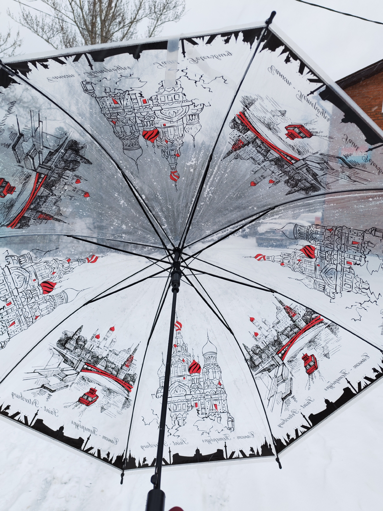 The image shows the inside of an open umbrella with a cityscape design, featuring illustrations of buildings and structures in a sketch style, primarily in black and white with red accents. The writin…read more