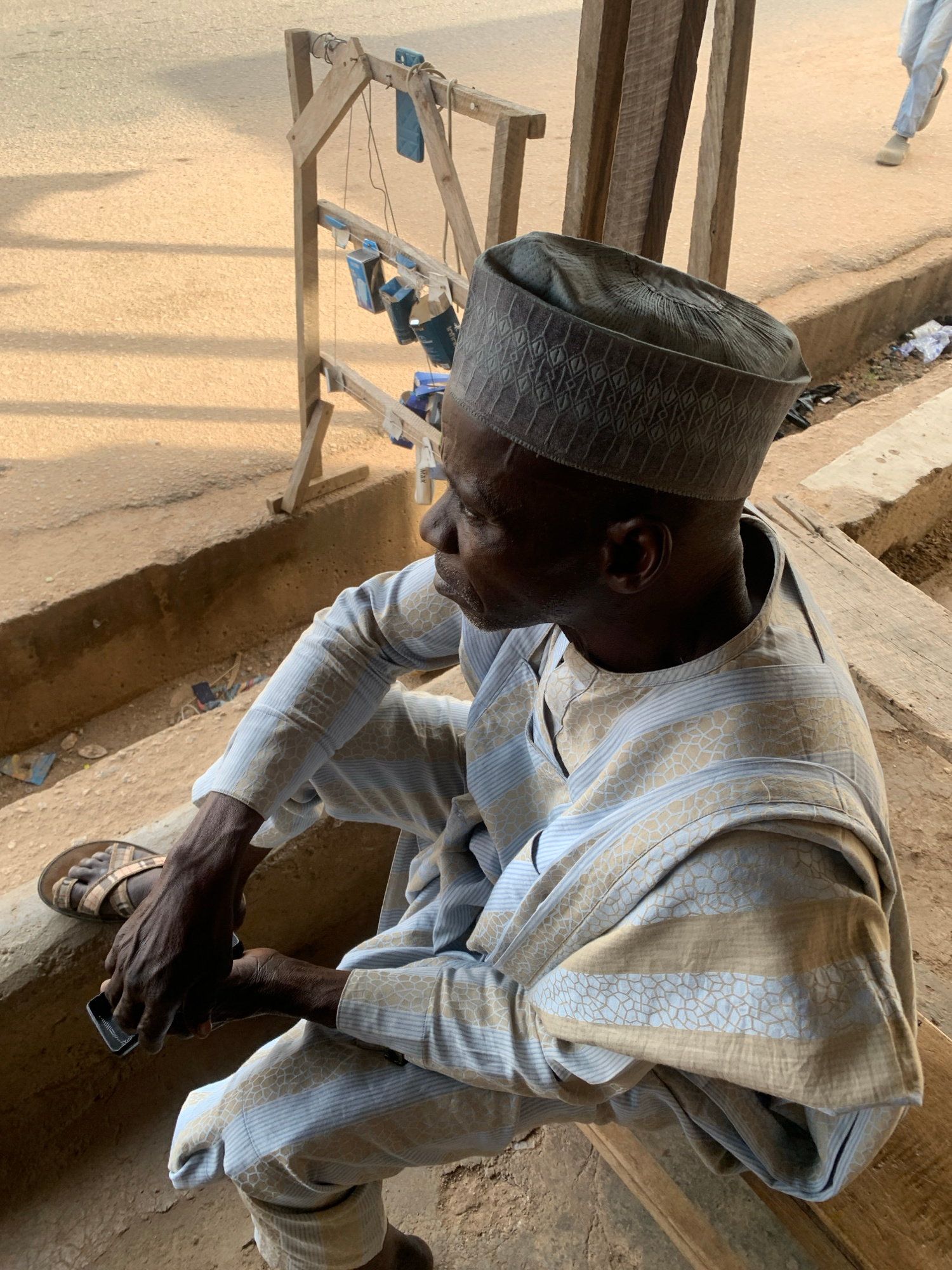 An elderly man wearing a traditional dark gray cap and striped, long-sleeved garment sits outdoors in Jos, Nigeria. He is holding a small, dark rectangular object in his hands. He wears a sandal on onβ¦read more