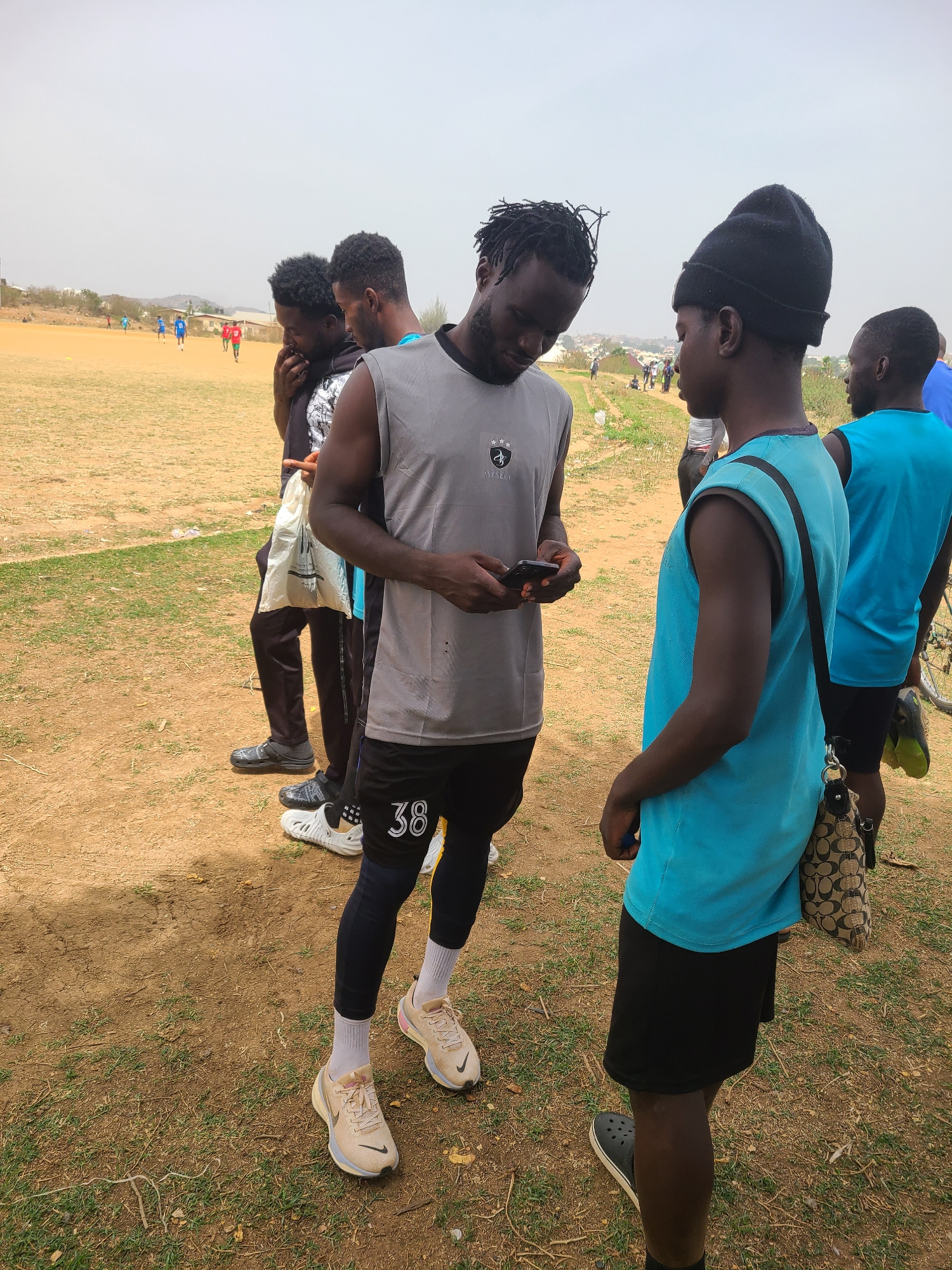 The image shows a group of at least four men standing on a dirt field in Barikin Jirga Summa, Nigeria. In the foreground, the man in the gray tank top with black leggings stands looking at his phone.…read more
