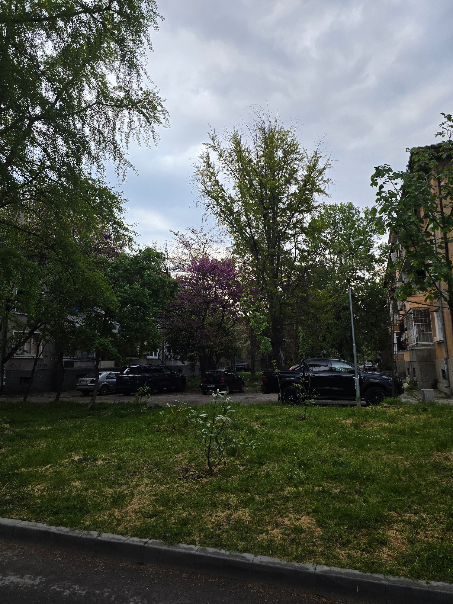 The image, originally oriented 90 degrees clockwise, captures an overcast daytime street scene in what appears to be a residential area of Plovdiv, Bulgaria. In the foreground, a verdant strip of gra…read more