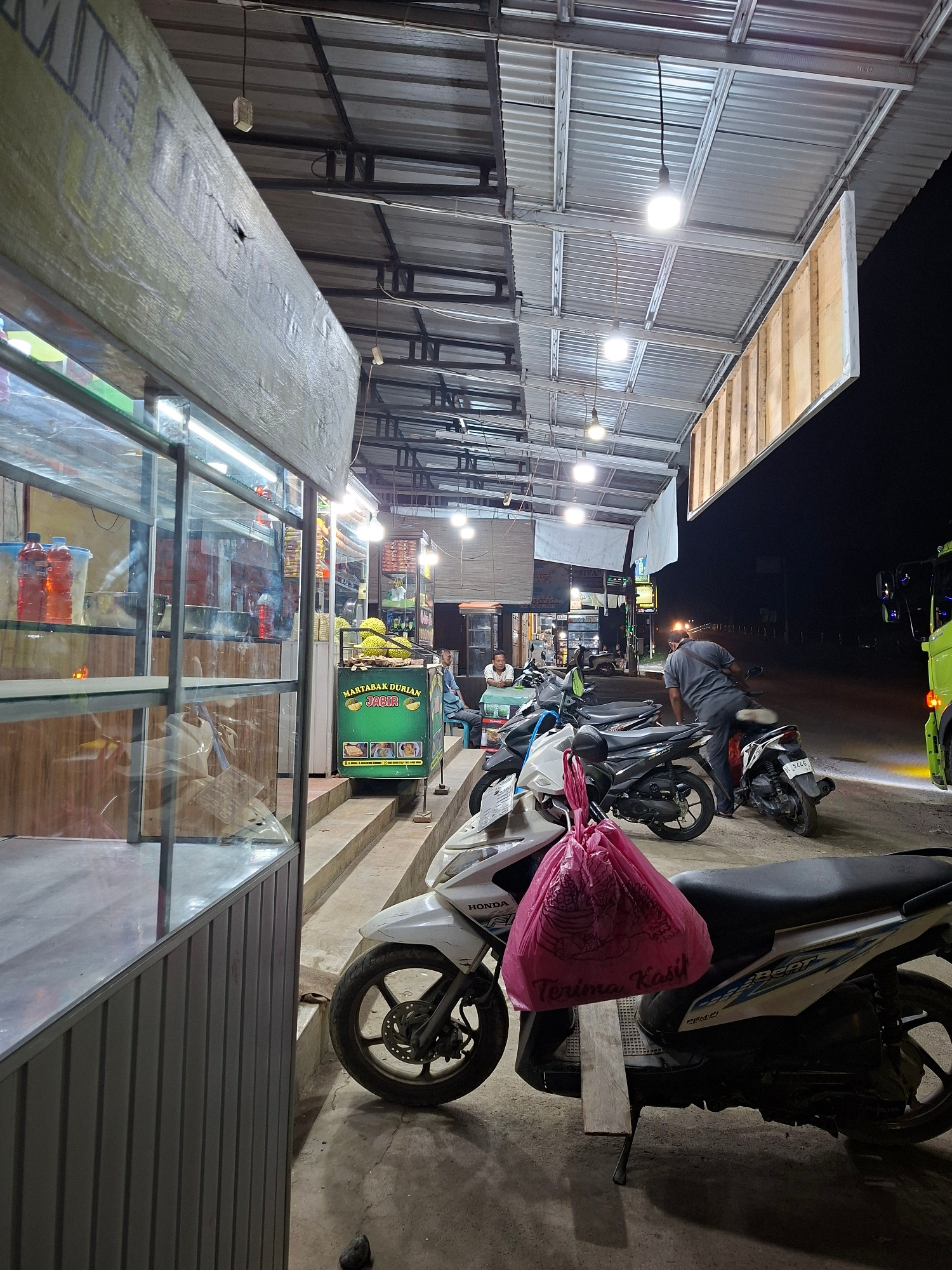 The image captures a nighttime street scene in Keudegeudong, Indonesia, likely a bustling food vendor area. The setting is illuminated by numerous bare light bulbs strung along makeshift structures, c…read more