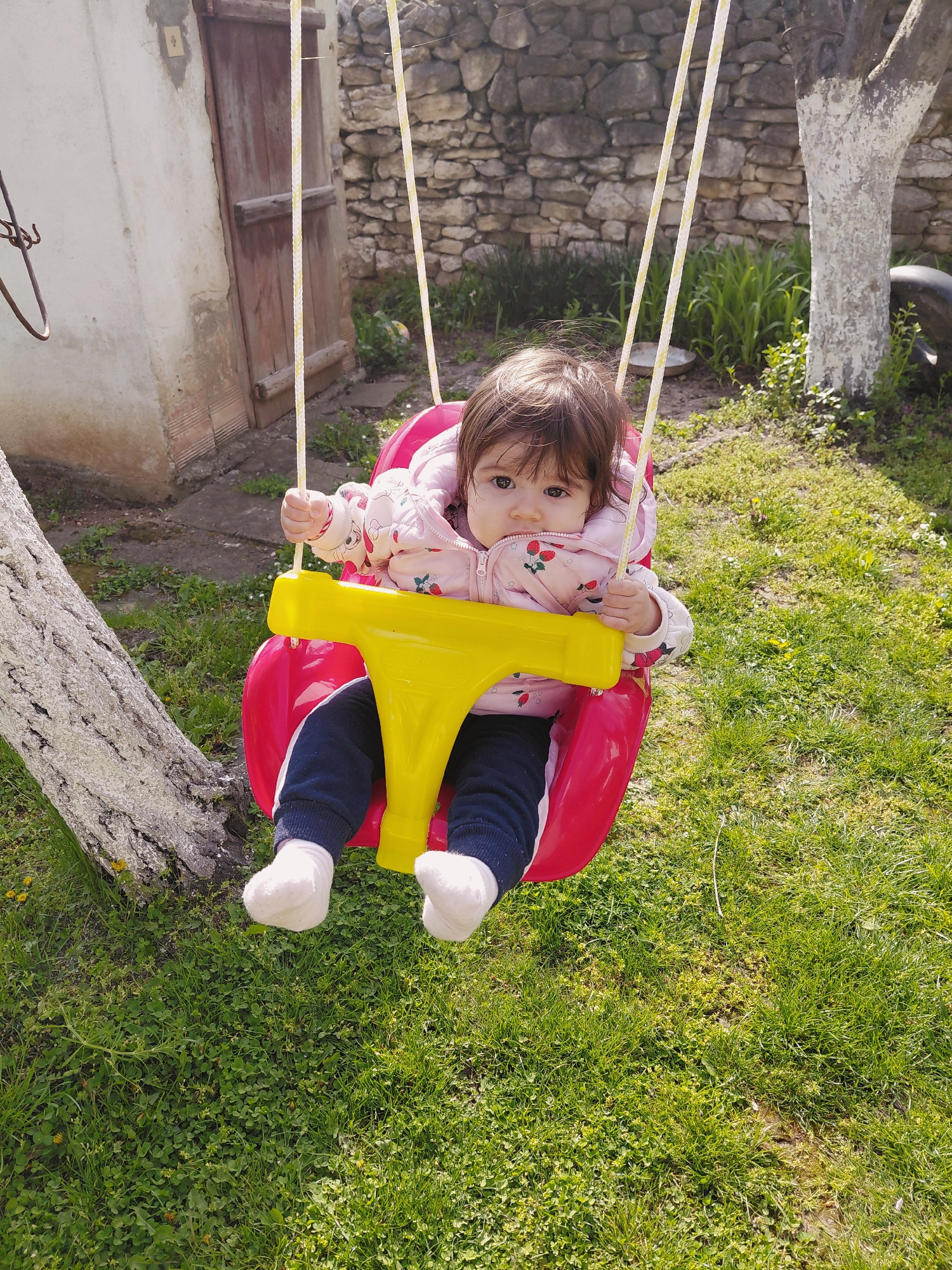 A child is in a red and yellow swing set in Samovodene, Bulgaria. The child is wearing a pink jacket with strawberry print and dark pants, and white socks. The swing is suspended by tan ropes. The bac…read more