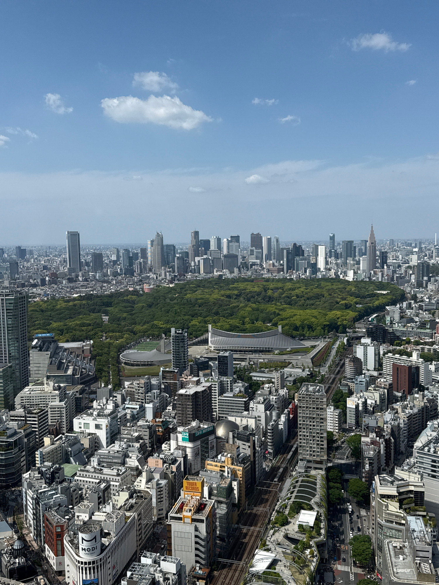 This is an aerial view of Tokyo, Japan, likely Shibuya, on a clear day with a blue sky and scattered white clouds. The city features a dense concentration of buildings, a long green park, and railway…read more