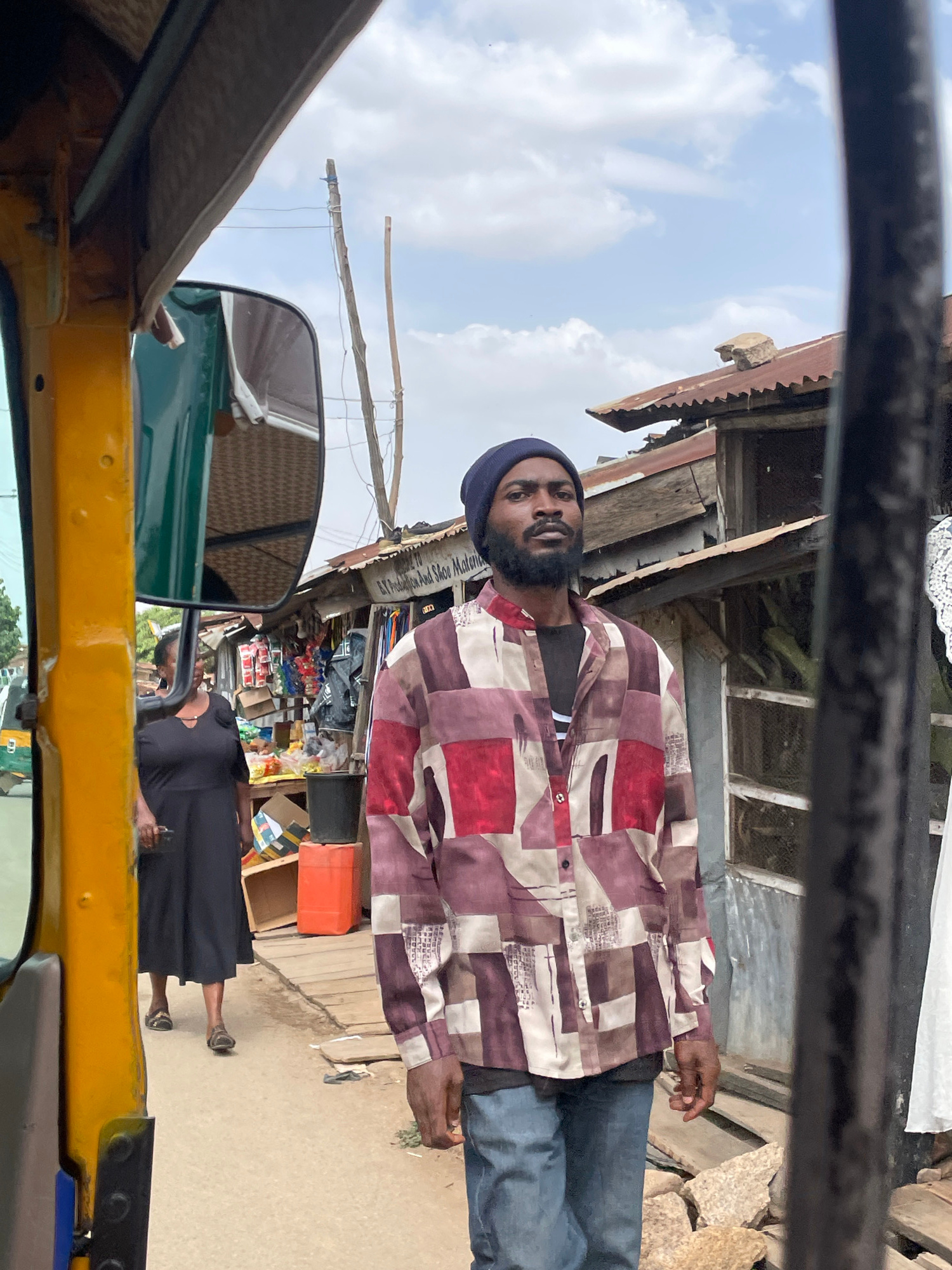 The image captures a street scene in Jos, Nigeria, likely from the perspective of someone inside a yellow tricycle taxi (keke napep). The photo is taken at eye level, looking across to the right side…read more