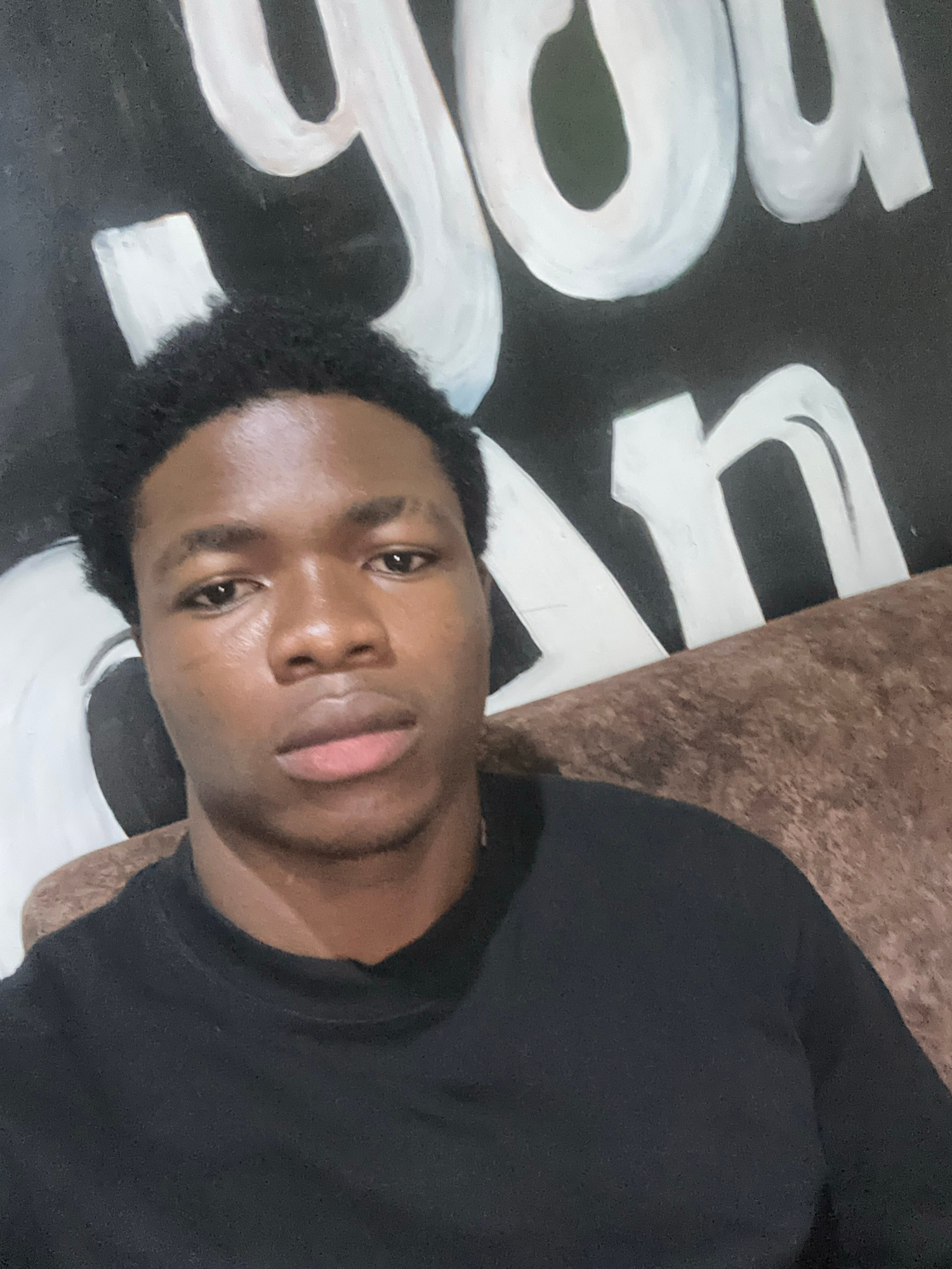 A medium shot shows a young, dark-skinned man wearing a black crew neck shirt. His face is centered and turned to the right. He has short, curly black hair and dark eyes. The background is black withβ¦read more