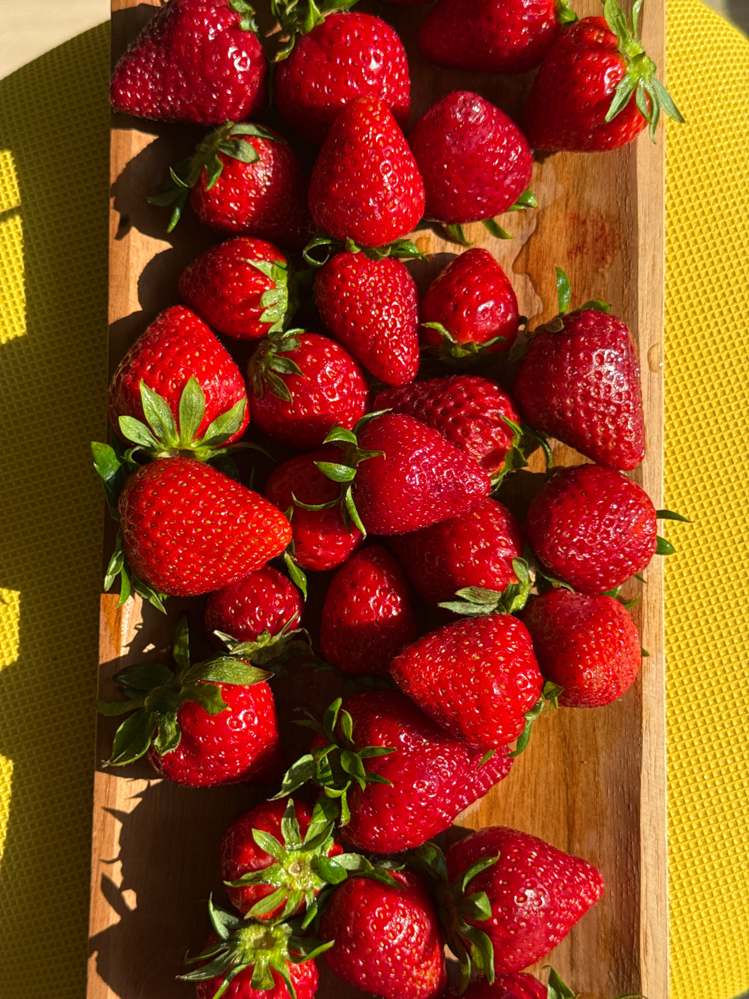 The image presents a close-up, overhead view of numerous fresh, vibrant red strawberries artfully arranged on a rustic wooden tray. Many of the ripe berries still retain their green caps and show smal…read more