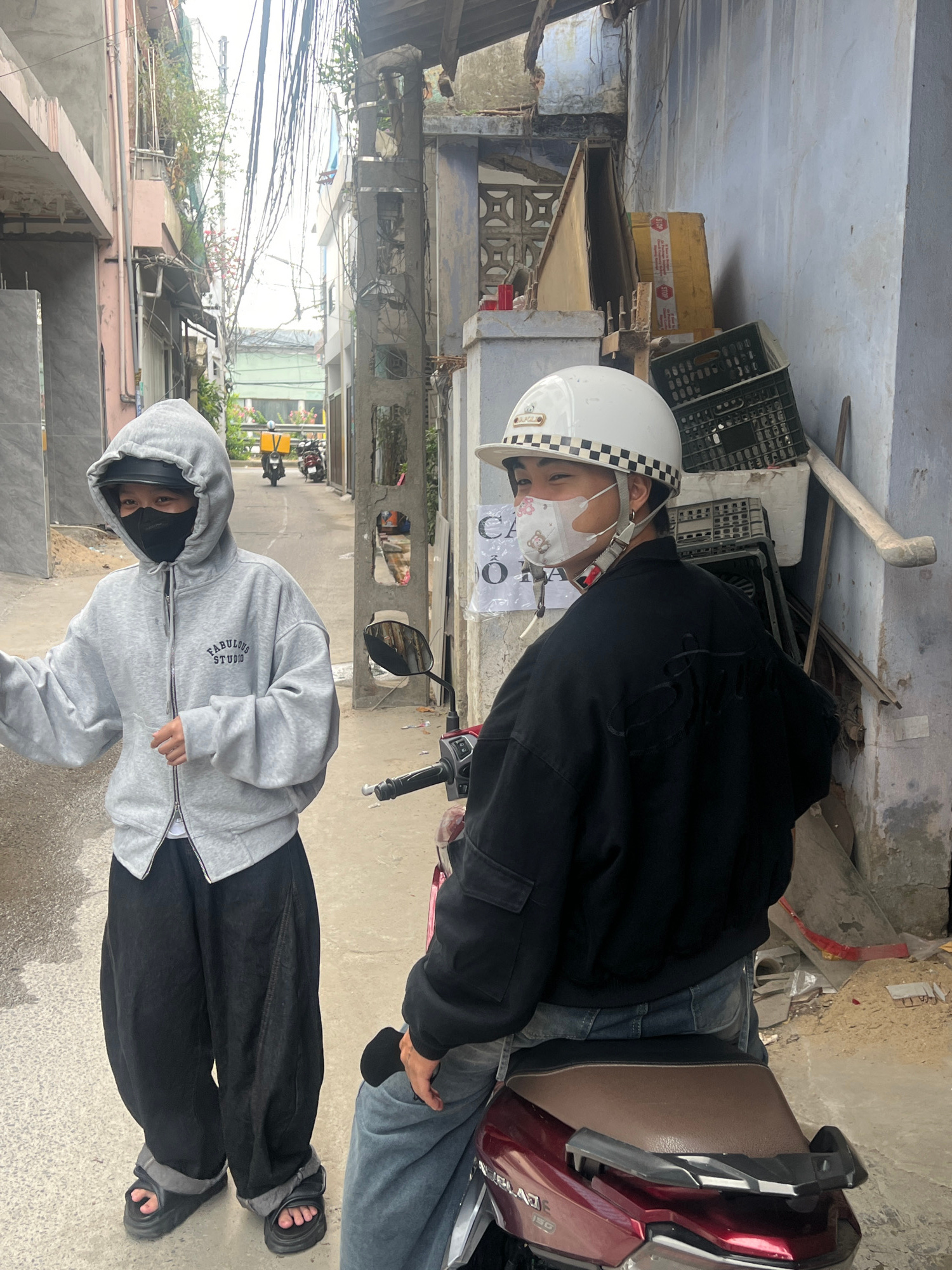 Two individuals are present in a narrow street or alleyway. One individual, wearing a gray hoodie, black pants, and sandals, stands facing the camera. Another individual is seated on a red motorbike,…read more