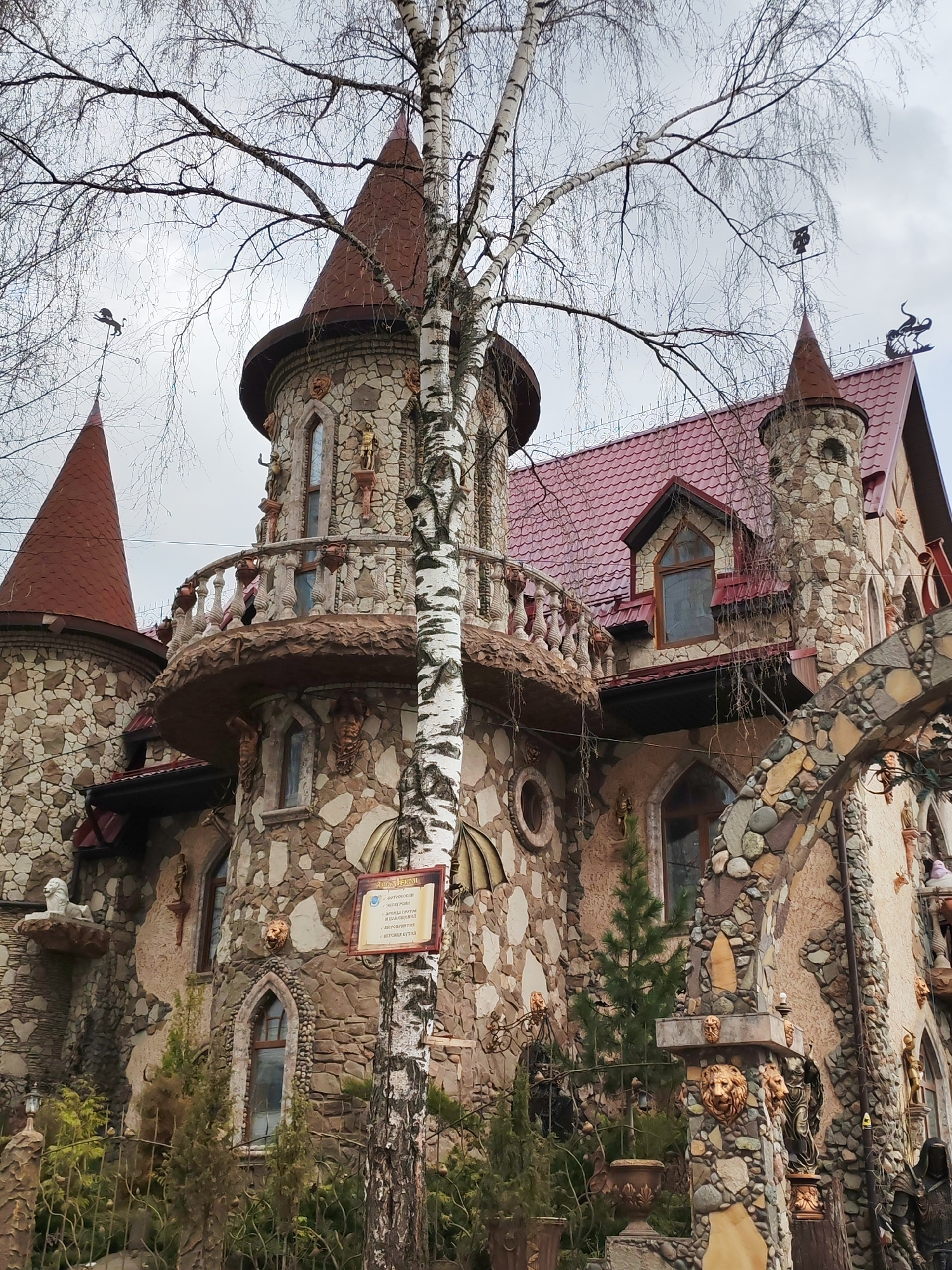 The image captures a whimsical, castle-like building in Izhevsk, Russia, with multiple turrets and red conical roofs, set against an overcast sky. A tall, bare birch tree stands prominently in the for…read more