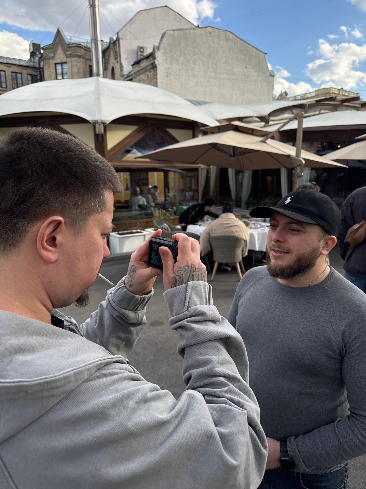 Two men are on a Moscow, Russia street. One man, wearing a grey hooded sweatshirt, is taking a picture with a small black camera of the other man, who is wearing a grey sweater and a black baseball ca…read more
