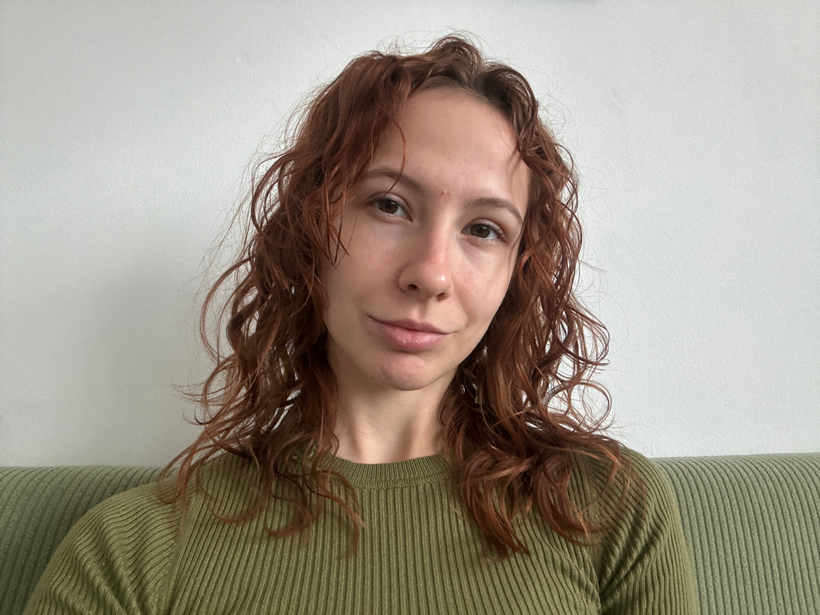 A woman with curly, reddish-brown hair is positioned upside-down in front of a white wall. She is wearing a ribbed, olive-green top. The image offers a close-up view of her face, revealing features liβ¦read more