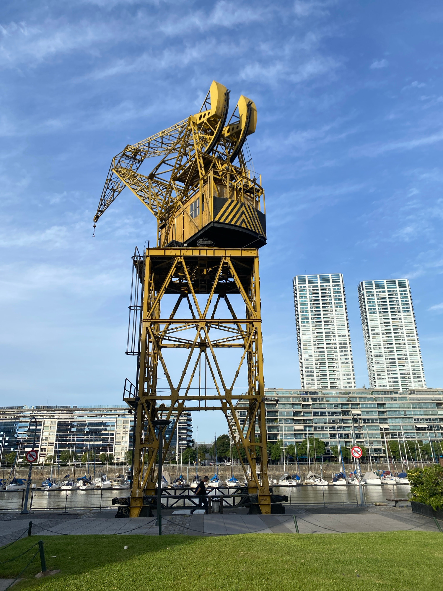 The image depicts a large yellow industrial crane in the foreground, with the city of Buenos Aires, Argentina visible in the background. The crane is constructed of steel beams and features a black anβ¦read more