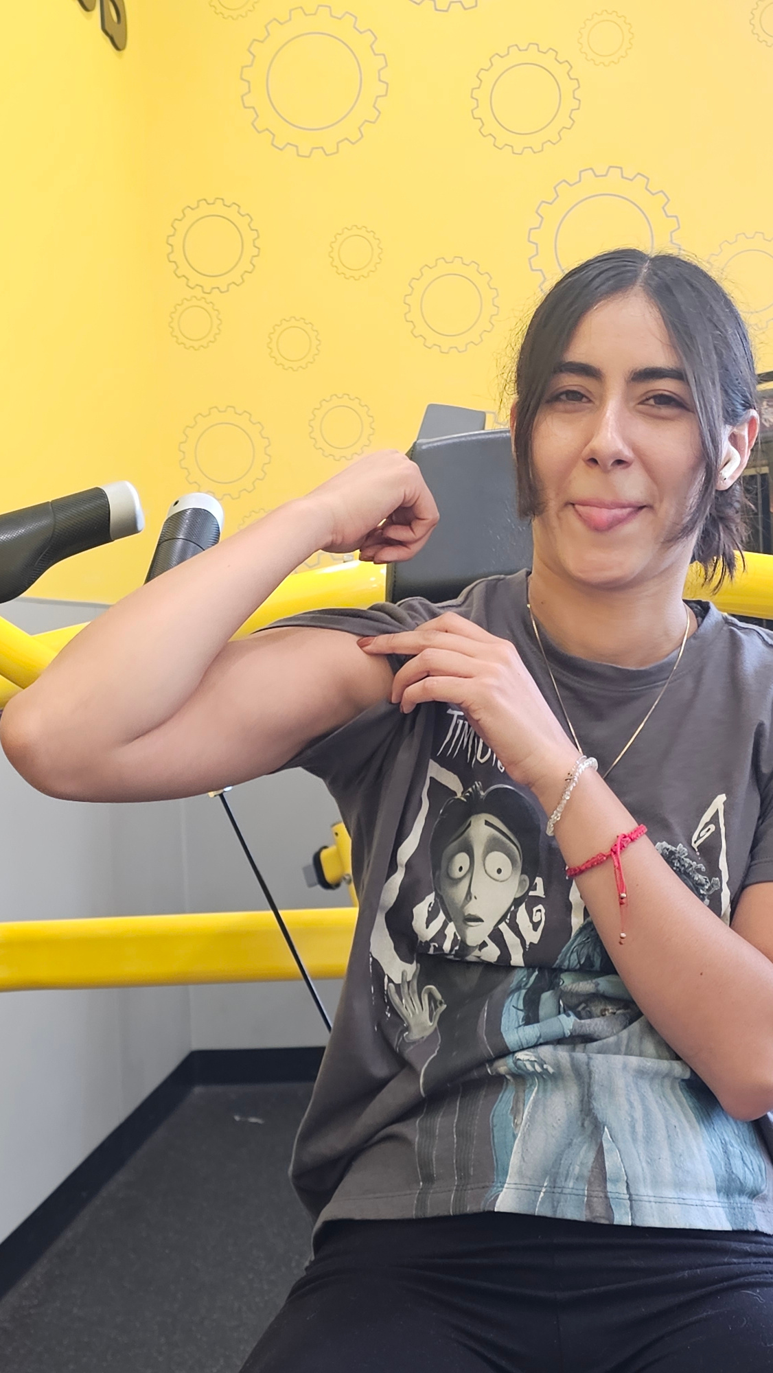 A woman is standing indoors in front of a yellow wall decorated with a pattern of gray circles. She is wearing a gray t-shirt with a graphic on it and black leggings. The woman is flexing her left bicβ¦read more