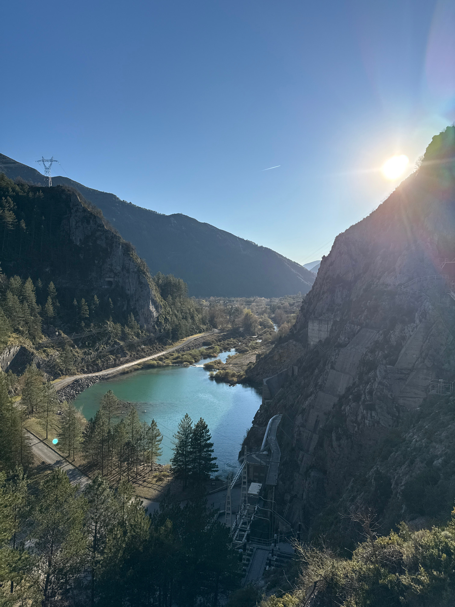 The image is a landscape photograph taken in Castellane, France, featuring a hydroelectric dam and its surrounding natural environment. The scene is dominated by a large dam that holds back a turquois…read more