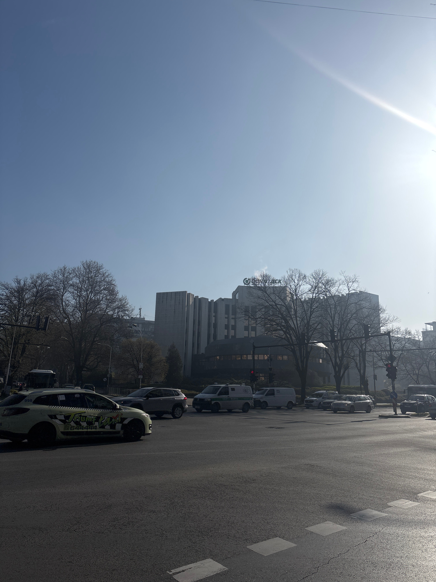 This image captures a street scene in Varna, Bulgaria, under bright, hazy sunlight. The photograph is oriented vertically, showing the sky on the left and a city street with buildings and vehicles on…read more