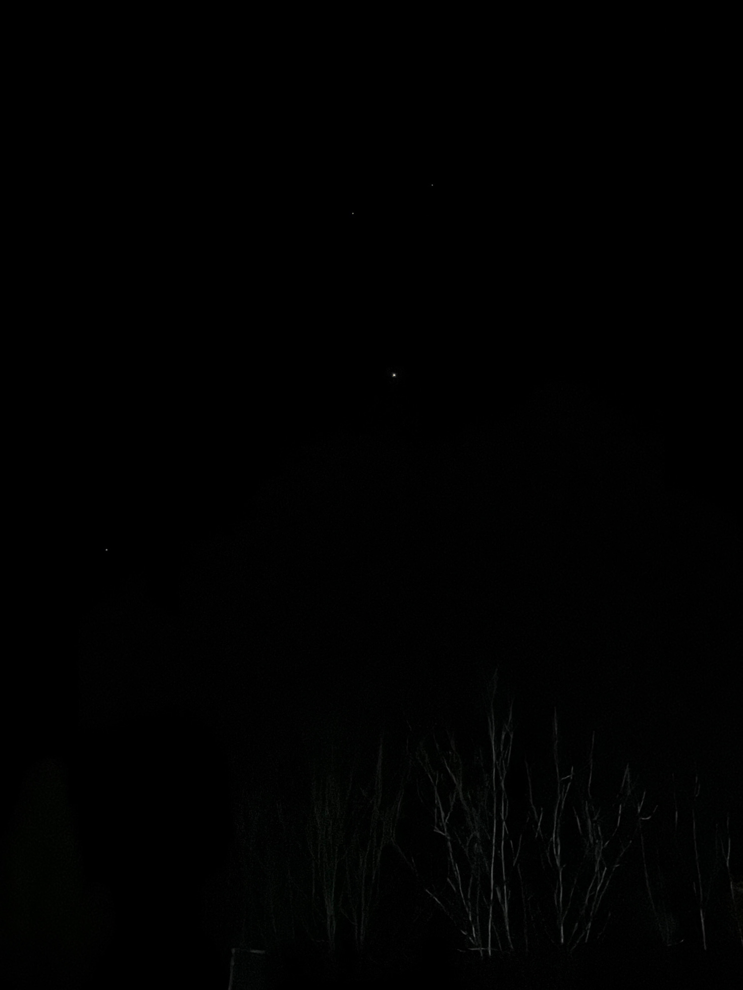 The image captures a dark, nocturnal scene, likely set in Dubovaya, Russia. The primary subjects are bare tree branches, densely clustered and occupying the right side of the frame. These branches app…read more