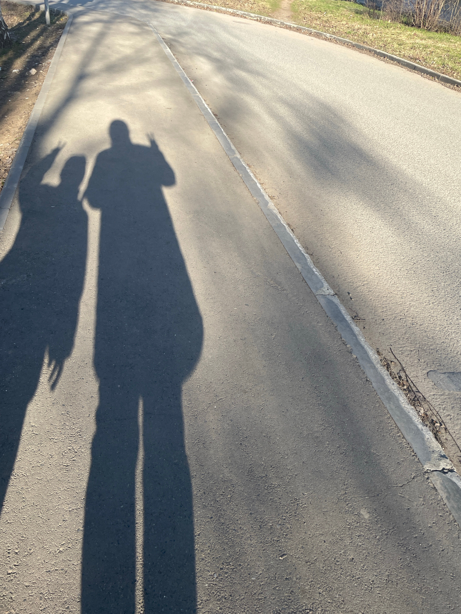 An overhead, slightly angled shot captures an asphalt path bathed in the low, warm light of a sun. The primary subjects are the long, distinct shadows of two people stretched across the path. One shadow, larger and with a clearer silhouette, suggests an adult figure, possibly wearing a hat or hood. Adjacent to it, a smaller shadow, likely that of a child, features a hand raised, making a gesture resembling a V-sign or two fingers extended. The activity depicted is implied by the shadows: two individuals are walking or standing on the path, with the sun behind them, casting their elongated forms ahead. Notable details include the time of day, which is either early morning or late afternoon/early evening, indicated by the low sun angle and the length of the shadows. The sharp definition of the shadows suggests clear, sunny weather. The path is made of asphalt, bordered on the left by a concrete curb alongside a strip of dry, light-green grass and sparse, brown vegetation. In some cropped views, a glimpse of a darker area, possibly water, can be seen beyond the grassy edge. Additional dappled shadows from tree branches or leaves are visible on both the asphalt and the grassy area, suggesting trees are nearby. The curb shows minor cracks and some natural debris. There is no visible text in the image. This scene is located in Noviy, Russia. | Open Wire