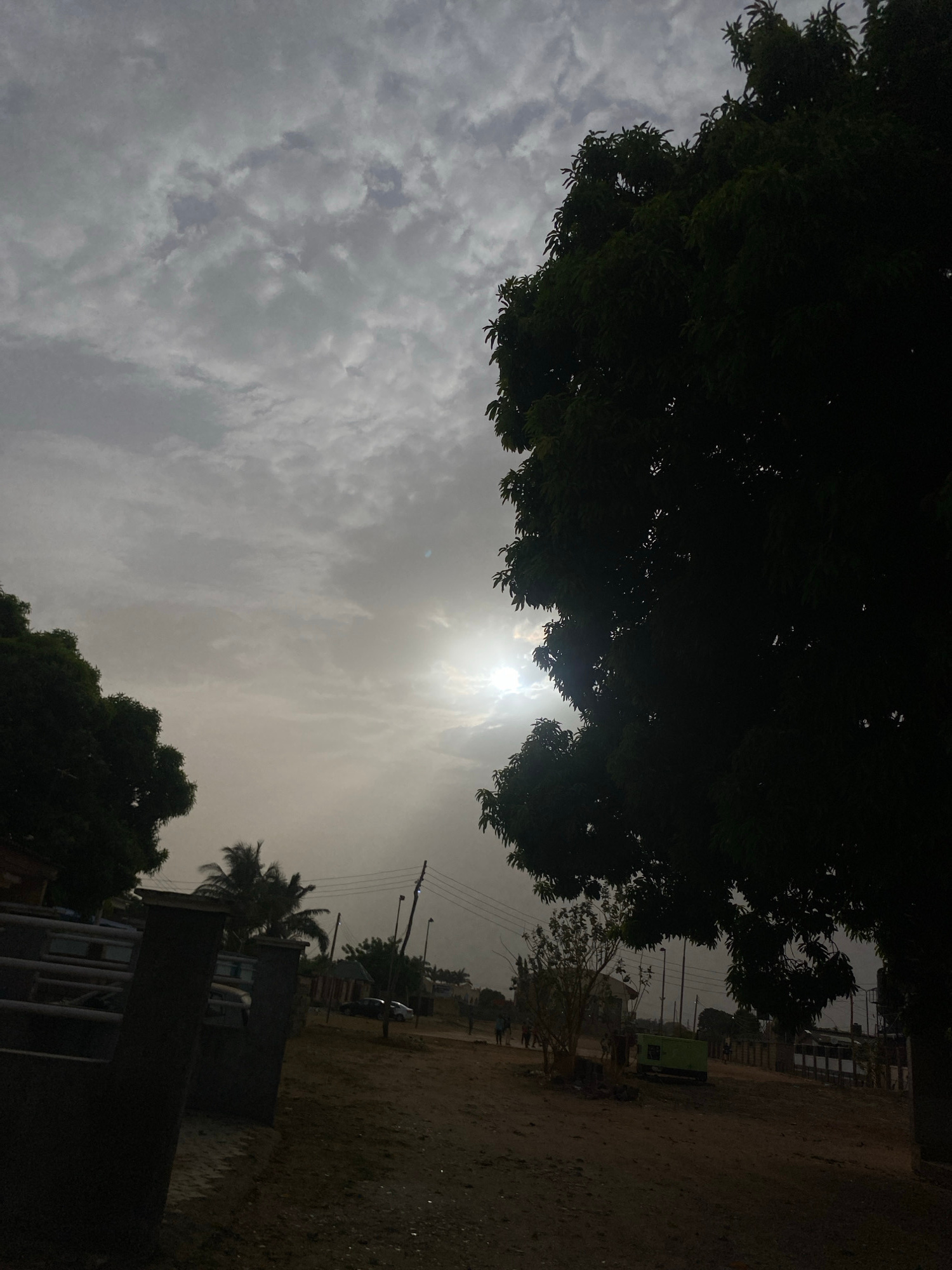 The image shows an outdoor scene in Barden Yana, Nigeria. The sun is positioned high in the sky, obscured by thick clouds. Trees with dense foliage are prominent in the foreground, framing the sky and…read more