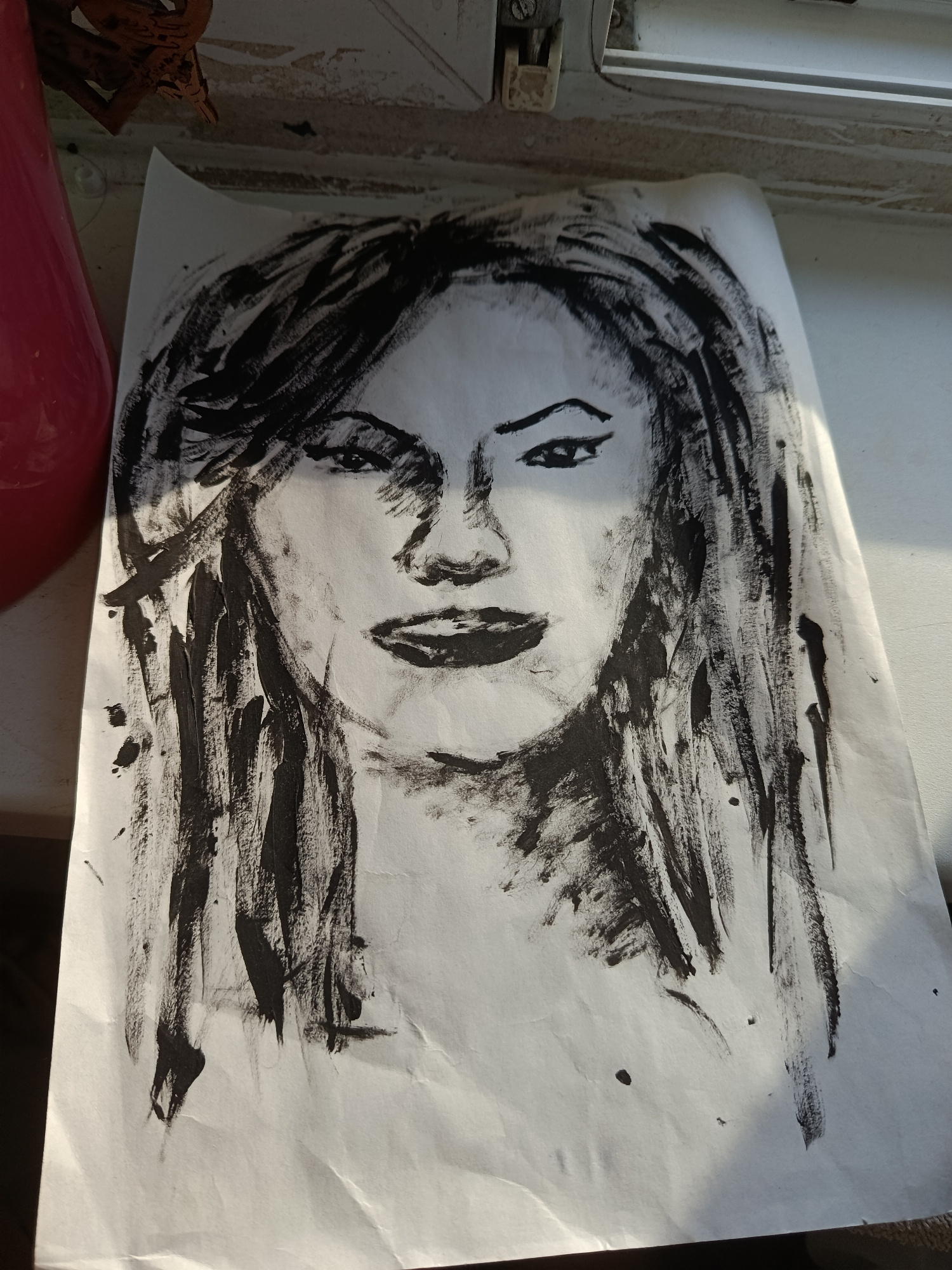 A charcoal drawing of a woman's face is lying on a surface, possibly a windowsill. The drawing features expressive, thick brushstrokes forming the woman's hair, face, and neck. The artwork has a somew…read more