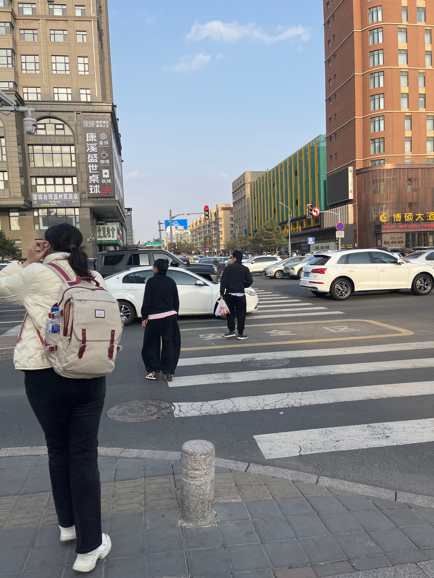 An urban street scene in Changchun City, China, is depicted from a slightly elevated perspective, showcasing a crosswalk, pedestrians, and surrounding buildings under a clear blue sky. In the foregrou…read more