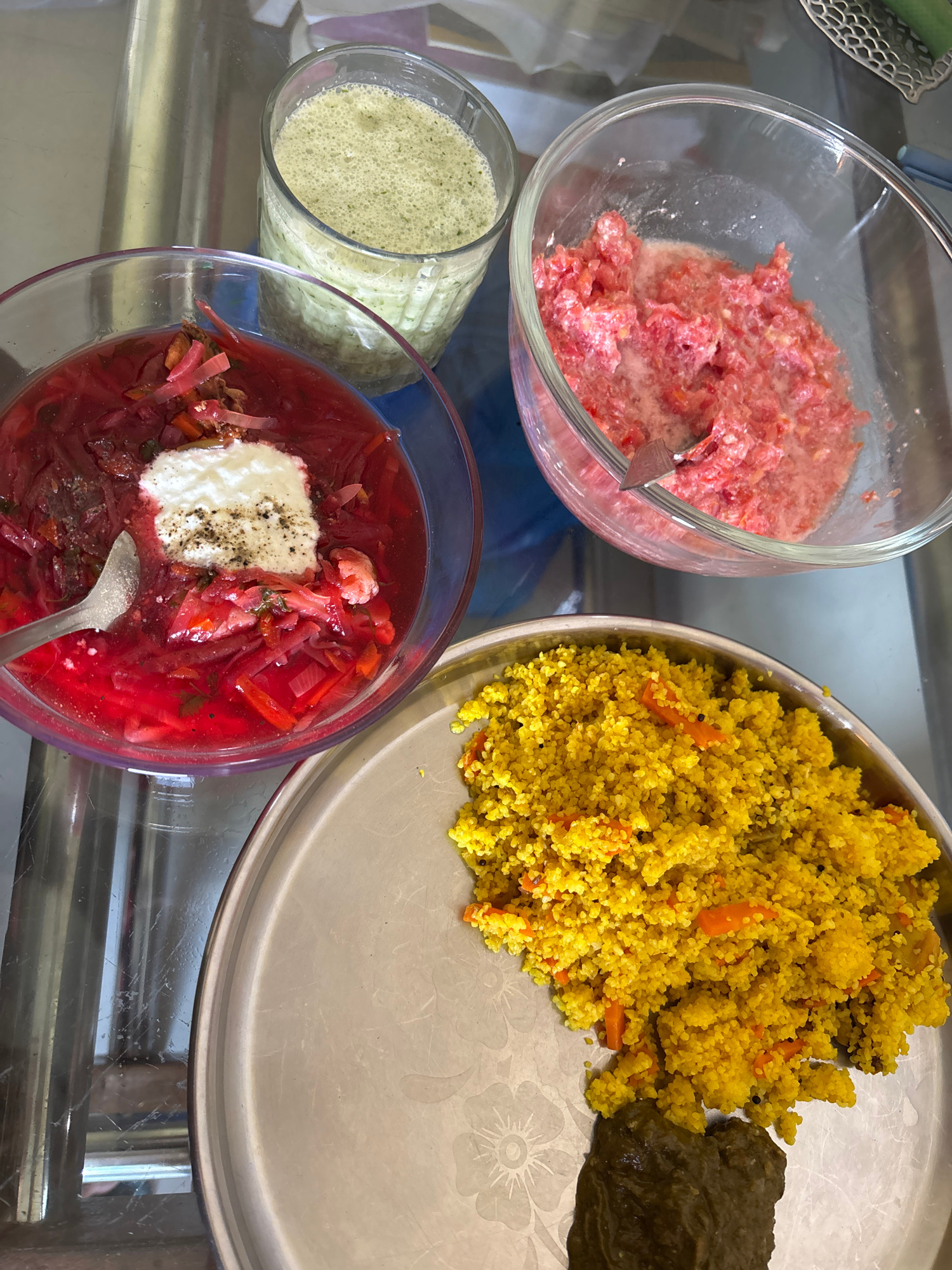 The image shows a variety of food dishes arranged on a reflective surface, likely a glass-topped table. There are four distinct containers: 1. A clear glass bowl filled with a coarsely chopped mixtu…read more